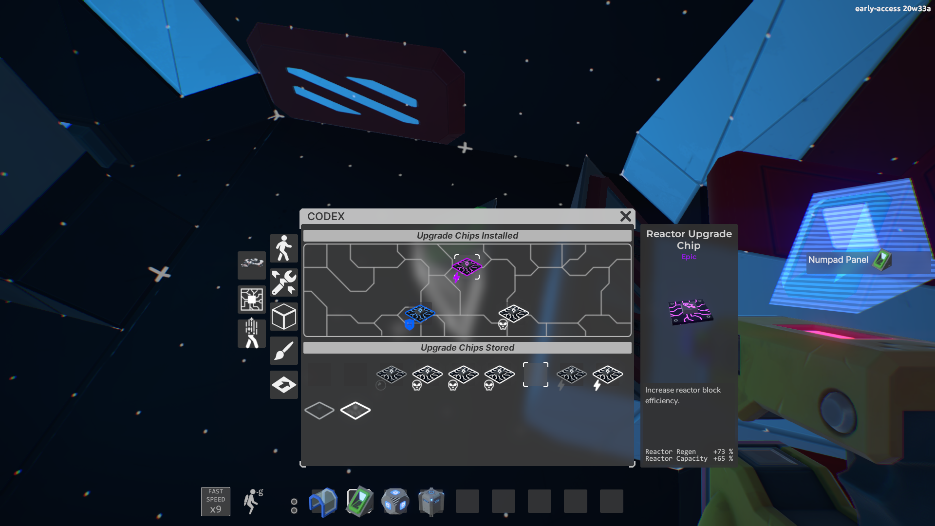 Upcoming: - The current inventory system will be made more complex in the future with cargo management. - More upgrade chip type will be added. - Chip switch will have to be made at a station. - An upgrade chip will increase the ability to get more upgrade slots (up to 14)