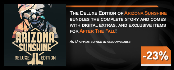 Arizona Sunshine is now available as a complete pack! Whether you're a VR veteran or new to virtual reality, if you're looking for the original zombie-obliterating experience then here it is! The Deluxe Edition bundles the game with all DLC and some digital extras, and an item pack for our upcoming co-op shooter "After The Fall"! If you already own any of the Arizona Sunshine game offerings, an upgrade to the Deluxe edition is available too.