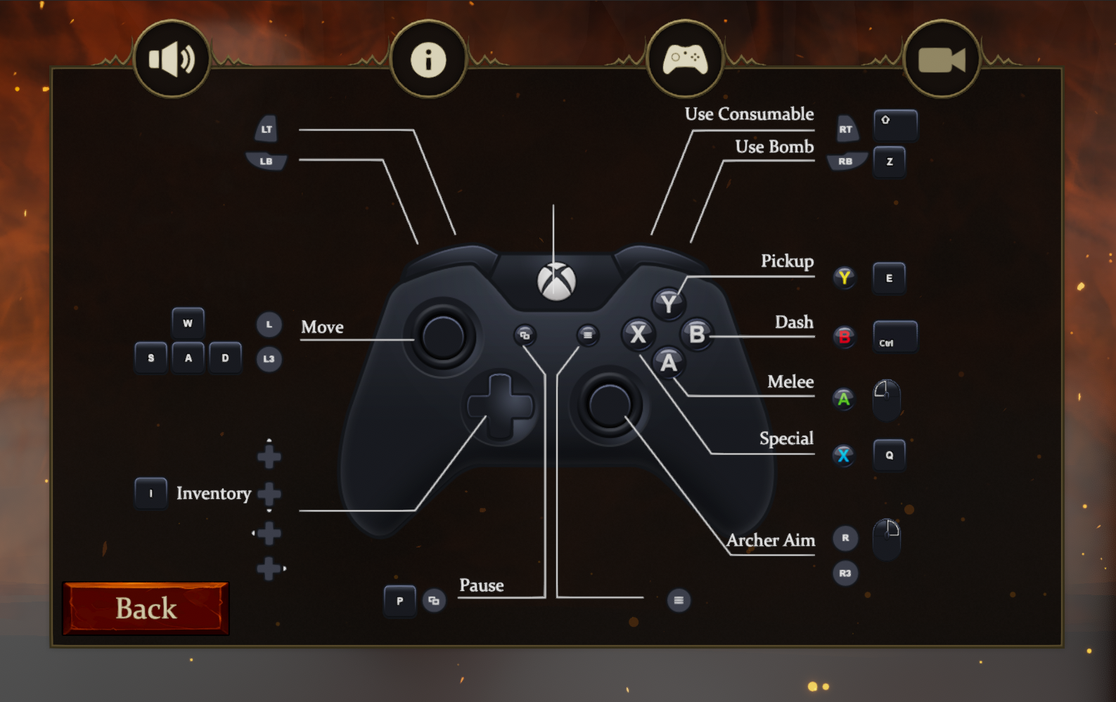 Many bugs were slaughtered in getting this to a stage were I felt happy to present a demo. That's not to say its totally bug free but its a damn sight better than it was 2 weeks ago. One or two things didnt quite make the cut such as details on how to control your hero. You can rebind the controls but below is an image showing the default controls.