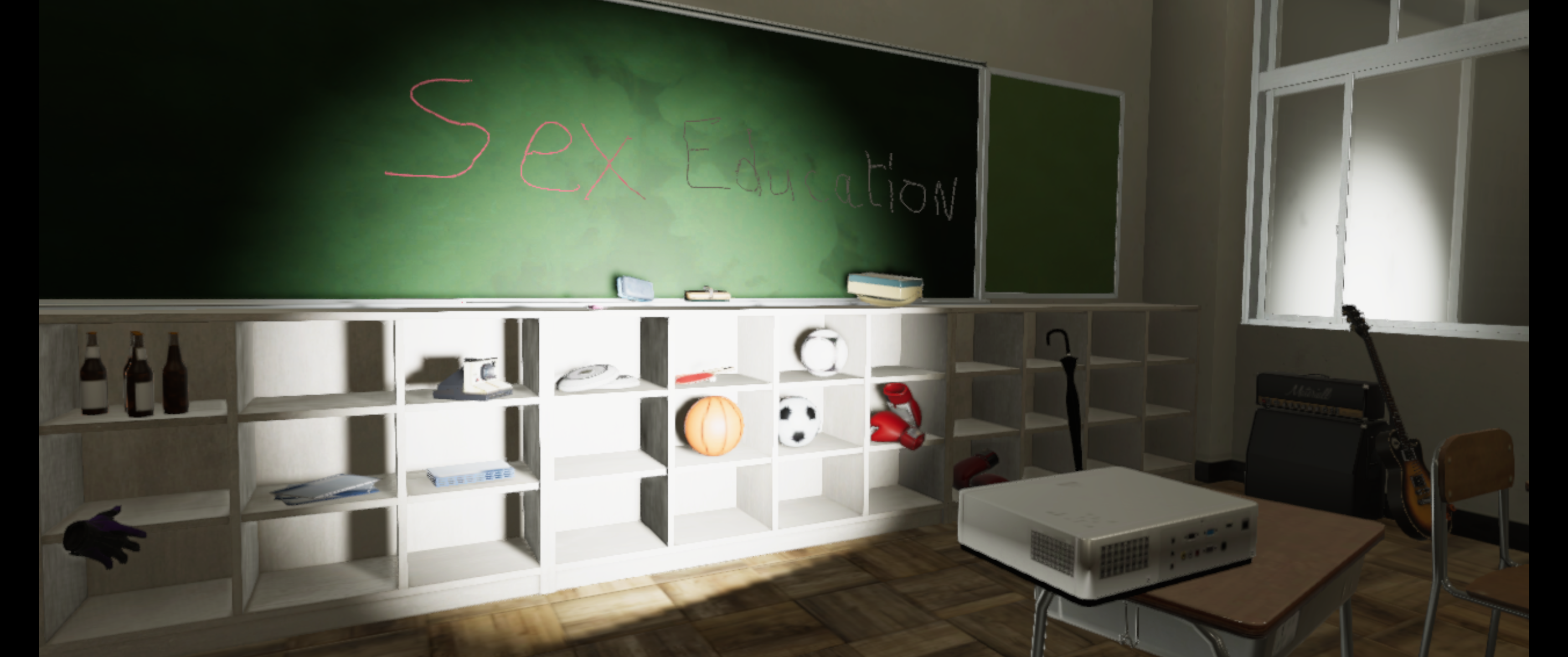 You can now destroy everything in a school classroom. The level also has some special objects, like the chalk, some basket balls, a frizbee.