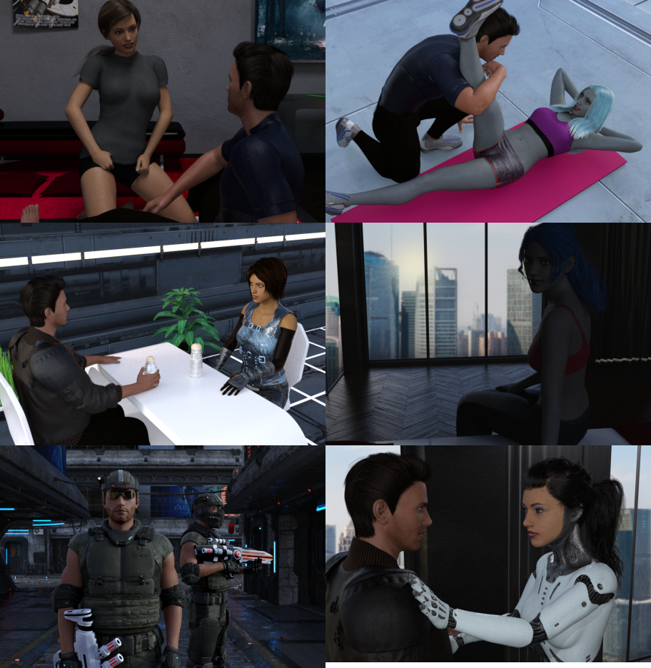 So, in this update I wanted to show you some of the 3D images of the in-game scenes. Since I've been making these in Daz3D software, I didn't need to hire an artist to do each individual image and only really needed to buy different 3D assets such as clothes and props for the scenes. This has been very efficient budget-wise. For this reason, I decided to put in more romantic scenes in the game, all done with 3D images. And by romantic scenes I don't just mean erotic ones, but also just casual dates and times spent with a romantic interest. On top of this, as mentioned previously, some of the main story scenes are also being done this way as 3D images so to create a more immersive atmosphere of the game's cyberpunk world. Top down 2D view has its limits in conveying the atmosphere, and these limits can be overcome with nice 3D images, I believe.