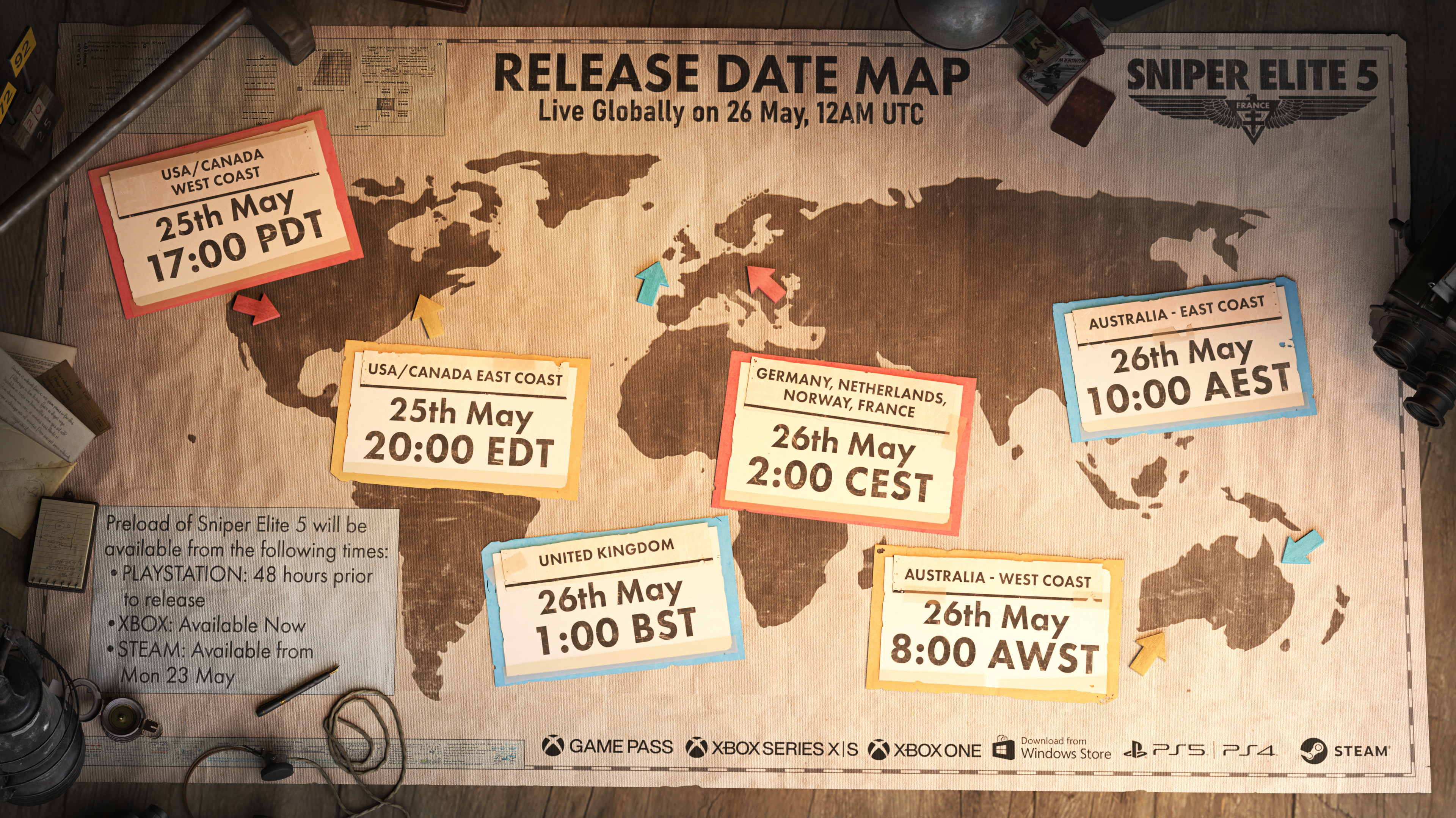 Below is a release date map, detailing the times Sniper Elite 5 will be available to play in your region.