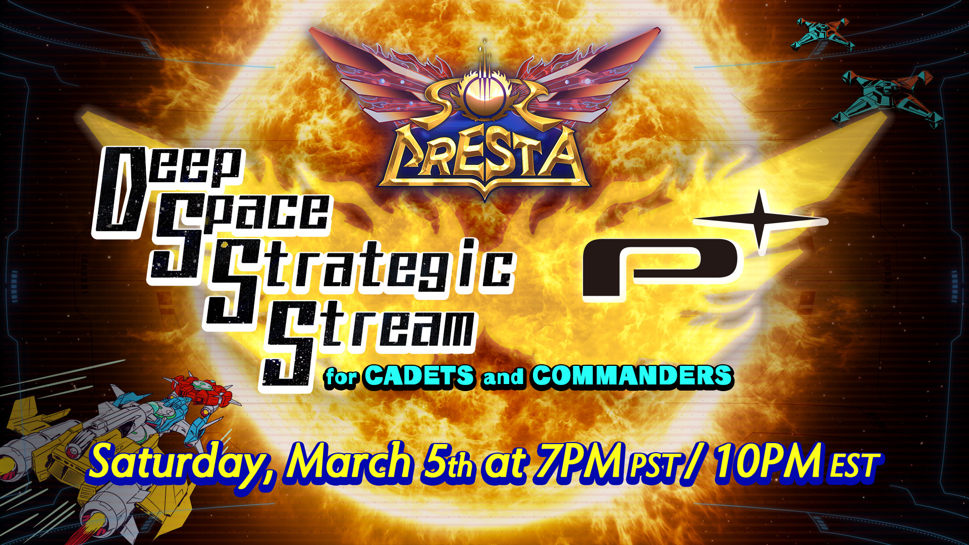 PlatinumGames will broadcast the “SOL CRESTA Deep Space Strategic Stream for Cadets and Commanders” on Saturday March 5th, 2022 at 7PM PST/10PM EST. *The stream was originally announced for Friday, March 4th at the end of the last stream, but has been delayed one day.