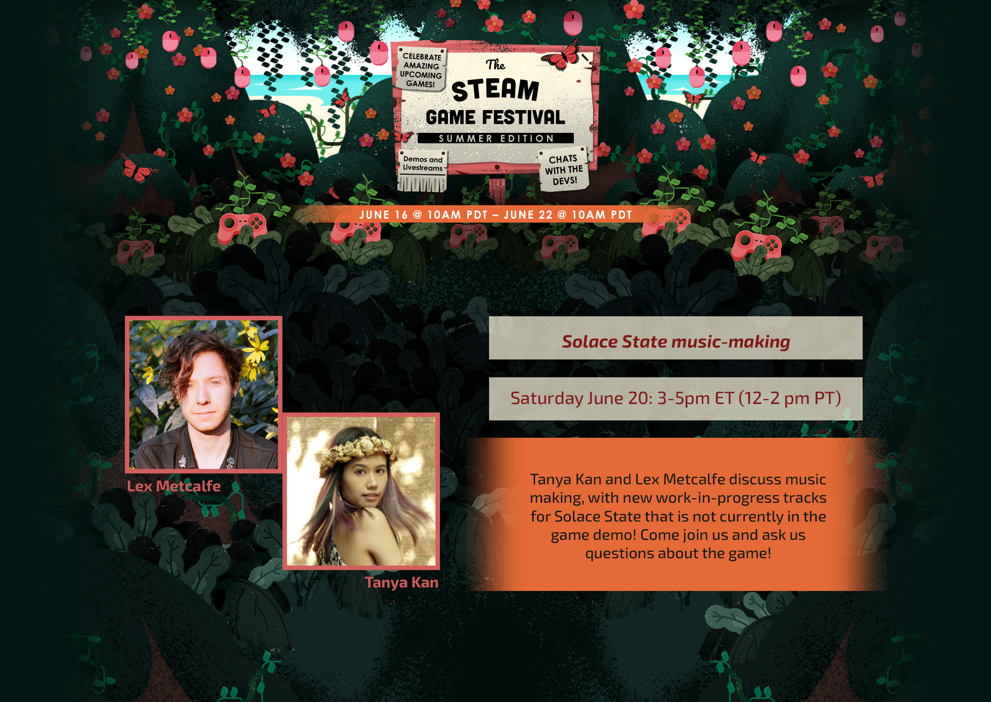 Herald in the final hours of the Steam Game Festival Summer Edition in style! Join Tanya Kan as she shares the latest in Solace State development. Talk to her about music, arts, and the latest build that she's testing!