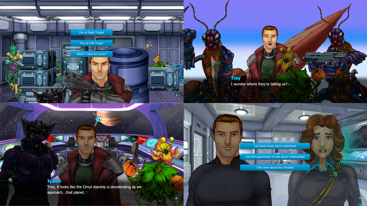 Build relationships with each of your alien crew on an adventure in space in this cinematic, choice-driven visual novel with RPG elements. Customize the skills of the protagonist, Trey Donovan, and make over 500 choices in this branching-path story with multiple, voice-acted endings that depend on the relationships you've built during your journey. Negotiate with powerful alien leaders to gain their trust, make crucial decisions as a starship commander, engage in choice-driven battles (optional), and pursue romance with one of the 2 female human contacts.