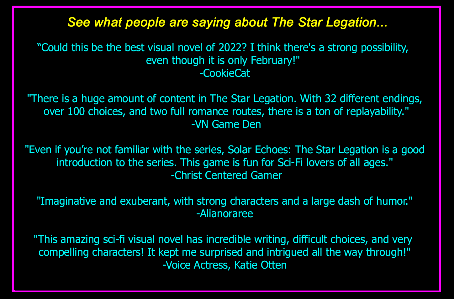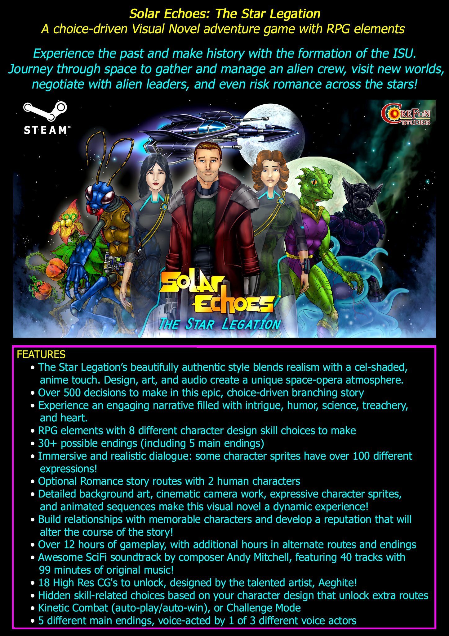 [p]The Star Legation is 50% off regular price, only $7.49 until July 10th! [/p][p]Adventure through space and visit strange new worlds while gathering a bizarre alien crew during the dangerous journey. Attempt to negotiate with powerful alien leaders and convince them to join the Interstellar Union. Your decisions will affect your reputation with every crew member and possible romantic interests as well. Can you build up a solid reputation and survive the trials ahead? Will you risk romance across the stars? In this scifi game, your choices really matter! Over 500 Choices with multiple, voice-acted endings! 40-track OST! 18 unlockable CG's! Adventure, Drama, Comedy, Mystery, with optional Combat and Romance.