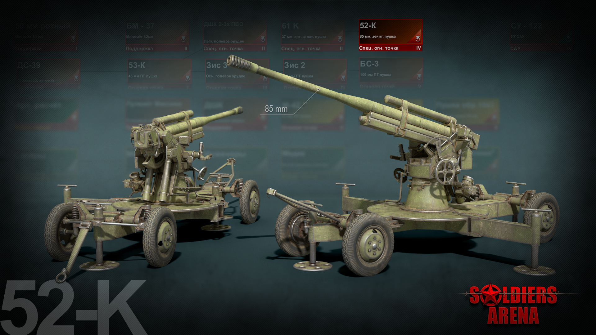 In Soldiers: Arena, not only the caliber of the gun plays a role, but also its rate of fire, visibility, speed of deployment, the speed of the projectile and the ballistic curve. We try to show it all. For example, ZIS-3 is a divisional gun with medium capabilities against armored targets, but excellent in counterbattery combat and support for the advancing infantry. ZIS-2 - a weapon with an excellent penetration. So much that in the early stages of the war it overpenetrated light German tanks from one end to another, often without causing perceptible damage. And was temporarily withdrawn from production "due to excessive armor penetration." That's why you need to use it exclusively against armored targets. Firing a 57-mm shell on fortifications and other cannons is simply wasteful. Because of the low explosive and fragmentation effect, the damage will be only psychological, and the incoming return will be a sight to behold. You can complain as much as you want that you can’t kill the tanks with the anti-aircraft guns, but maybe it was not intended for that purpose? Maybe there is a tool more reliable? For example, 52-K is primarily an air defense weapon. Yes, it belongs to those anti-aircraft guns which were successfully used simultaneously against armoured targets too, but it was more a necessity than a preference. Because of the high silhouette, the complexity of transportation and the bad concealment of it’s position, it can be very quickly detected and killed. This does not negate the fact that the 52-K with its 85-mm shell and excellent rate of fire copes well with medium tanks, it's just worth weighing the risks. With a lot of luck, it can even cope with some heavy ones at close distances, but when entering into such a battle it is to be expected that this fight will be it’s last one. At distances from which the BS-3 will pierce the Tiger, the 52-K will only scratch it, so why not focus on such targets for which armor piercing is not so important. When you see infantry and motorized enemy units moving to you, the rate of fire will do the best.