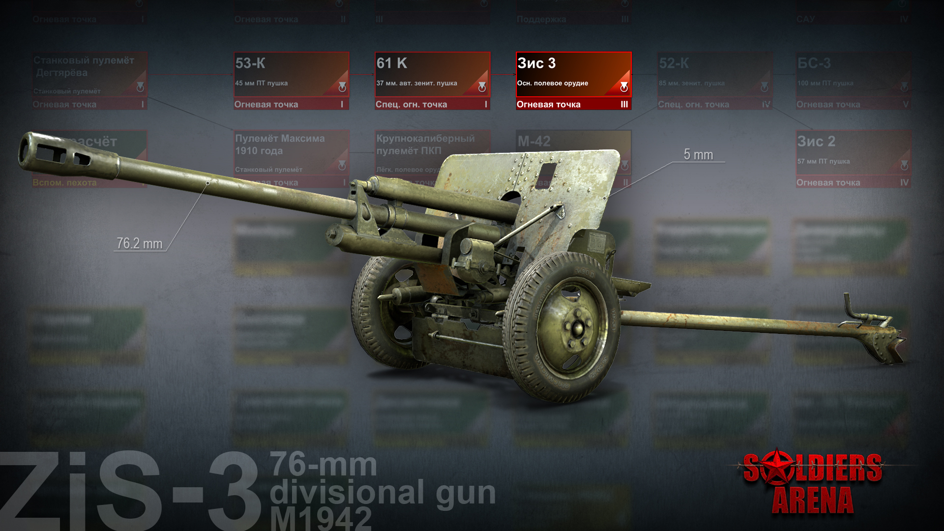 ЗИС-3 доступная, недорогая пушка, которая отлично подходит для начала и середины игры. Большим плюсом данной пушки, является относительная легкость, благодаря чему ее можно перемещать силами расчета. Она так же, как и реальный ее аналог, мало что может противопоставить средним и совсем ничего - тяжелым танкам, но имеет достаточно возможностей втоптать в грязь вражескую пехоту, засевшую в домах, и легкую технику противника. Главной же ее функцией является поддержка пехоты, как в обороне, так и в наступлении. Ведь Soldiers: Arena командная игра и без поддержки в ней не обойтись!