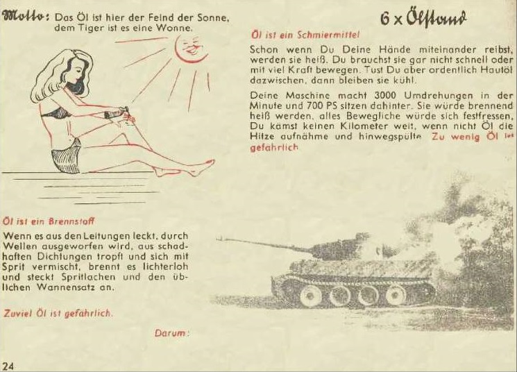 The manual for Pz.VI was a bit unusual. To interest the tank team to read the it ( in fact no one likes to read boring tutorials, huh? ), Guderian gave the green light to the creation of Tigerfibel. This manual contains in addition to the boring diagrams funny diagrams too, interleaved by erotic illustrations and jokes. It is good soulful guide, as we think! You can see the full Tigerfibel here . Have a nice day and happy reading!