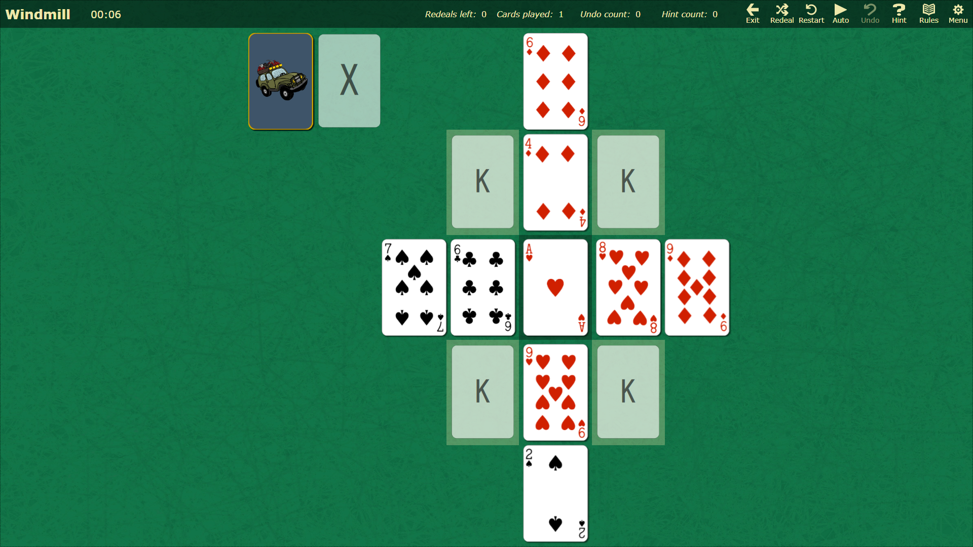 Enhancement to hint system: If you have a card selected and request a hint, the game will show you all of the places where the selected card can be played. Warning: This incurs the 5 point hint penalty for each possible play that is shown. Single card selection must be enabled in Settings for this to work.