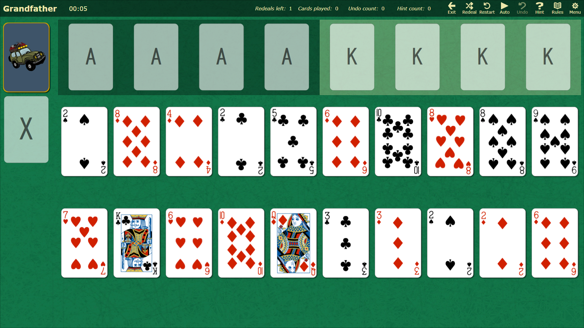 A rather unique variant with a center foundation that is built upwards until it holds 52 cards, along with 4 corner foundations that are build down from King to Ace.
