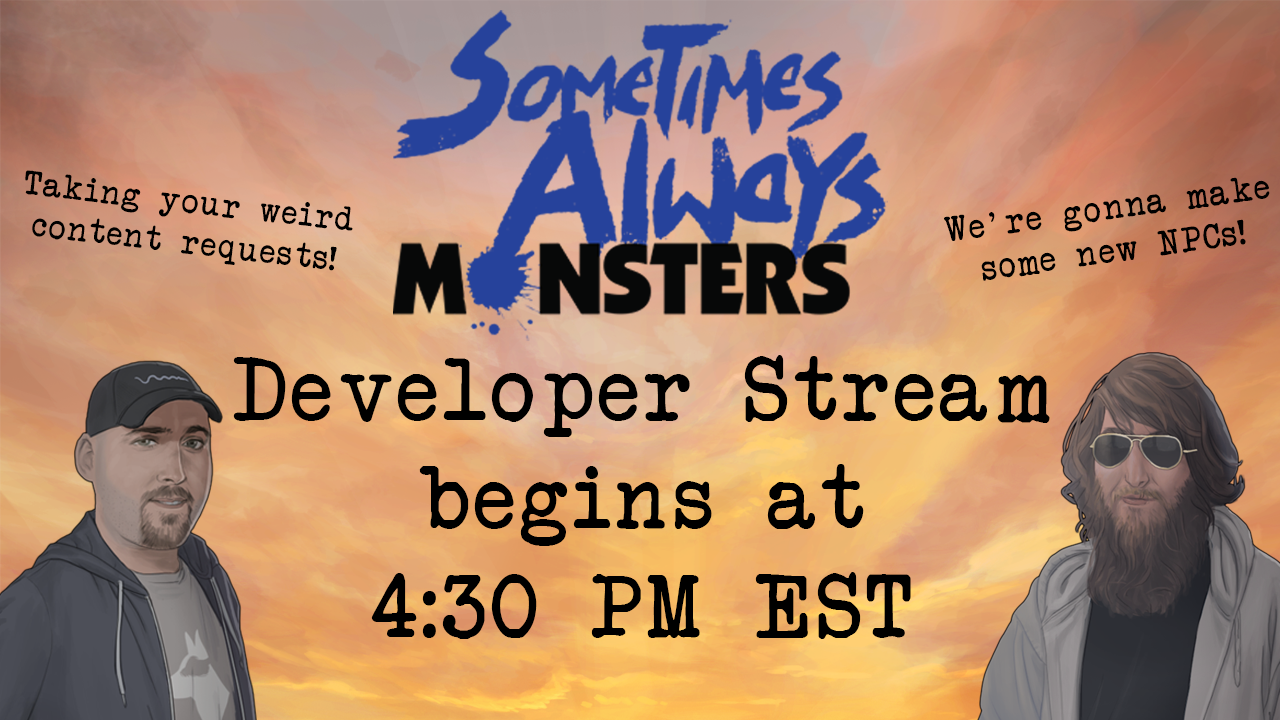As part of the promotion we'll continue doing daily streams for both Always Sometimes Monsters and Sometimes Always Monsters, returning to Steam Broadcast (instead of Twitch) until this weekend. They've been very productive for us, and have resulted in the new content you'll find in this update.