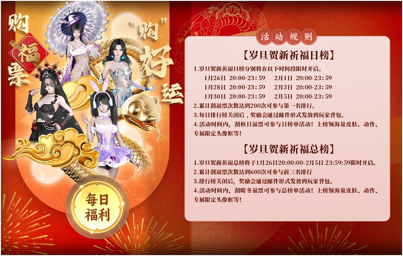 Event Time: Starting after the version update Daily, you can obtain one blessing ticket for free at the "Blessing Ticket Shop" interface. The "Daily Blessing Ranking" will be open for a limited time during the following periods: January: 26th, 28th, 30th 20:00-23:59 February: 1st, 3rd, 5th 20:00-23:59 New Year limited ranking list! The highest reward includes "Xia Shiyu - White Night Witch," "Li Xiaotu - Star Track · Aries," "Wei Qingyu - Star Shining TRY · Y," and other abundant rewards. The "Overall Blessing Ranking" will be open for a limited time from January 26th, 20:00:00 to February 5th, 23:59:59 The highest reward includes "Ouyang Miaomiao - Star Track · Aquarius," "Wei Qingyu - Peach Bubbles," "Li Xiaotu - Evil Spirit Doll · No. 2," and other abundant rewards. The ranking rewards for this event are adjusted as follows: Daily Ranking 1st: 1st place reward + 2nd-3rd place skin rewards + 4th-10th place skin rewards Daily Ranking 2nd-3rd: 2nd-3rd place rewards + 4th-10th place skin rewards Overall Ranking 1st: 1st place reward + 2nd-3rd place skin rewards + 4th-10th place skin rewards Overall Ranking 2nd-3rd: 2nd-3rd place rewards + 4th-10th place skin rewards