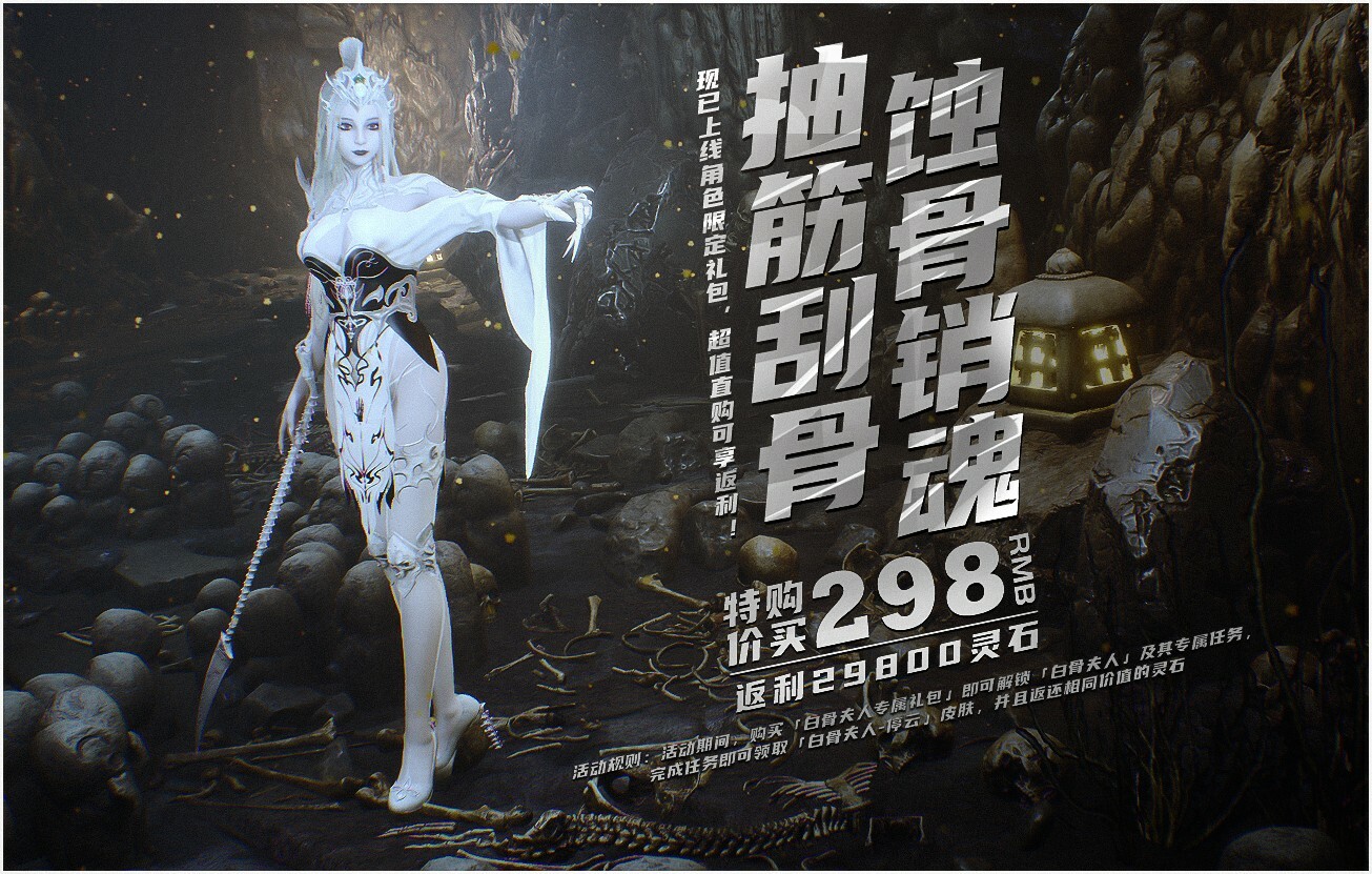 Torturing sinews and scraping bones, eroding the soul! Event Time: Starting after the version update During the event, purchase the "White Bone Lady Bundle" to unlock "White Bone Lady" and her exclusive tasks. Completing the tasks will return the full amount of Spirit Stones and unlock the "White Bone Lady - Stopping Clouds" costume.