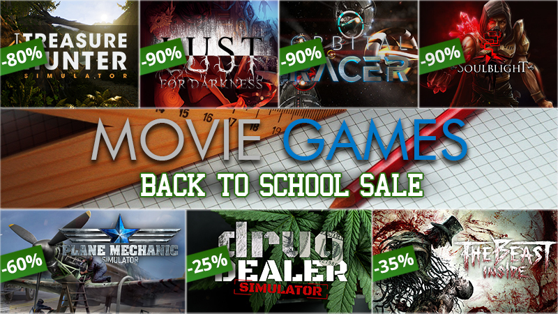A very spooky Halloween discount is already here! From today until 2 November you can buy Soulblight 90% cheaper! Do not wait and grab an offer if you are not afraid yet!https://store.steampowered.com/app/803980/Plane_Mechanic_Simulator/ https://store.steampowered.com/app/523650/Lust_for_Darkness/ https://store.steampowered.com/app/723100/Orbital_Racer/ https://store.steampowered.com/app/682990/Drug_Dealer_Simulator/ https://store.steampowered.com/app/792300/The_Beast_Inside/ https://store.steampowered.com/app/748300/Treasure_Hunter_Simulator/ https://store.steampowered.com/app/530930/Soulblight/ Movie Games - Back to School Sale! September 11, 2020
