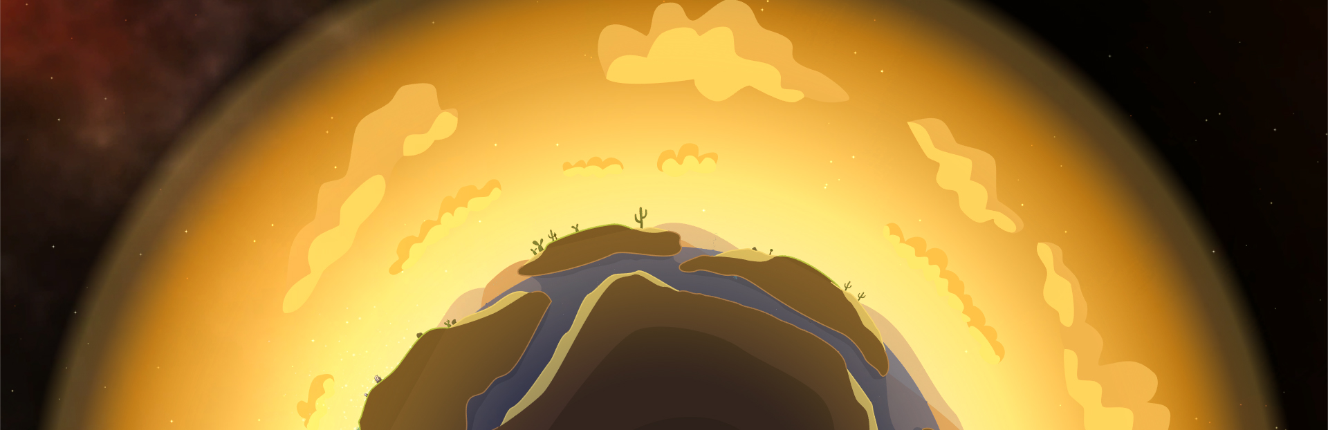 While creating the new planets I experimented with an idea suggested here in the forums to make a 'dark' planet (see example pic above). You probably already realize that Space Bob's art style doesn't use lights so it's not as simple as turning off a light to make things dark. Instead I experimented with overlaying dark transparencies to create the illusion of darkness. This worked surprisingly well to alter the mood and atmosphere especially on the asteroid planets. My experiments with this lead to trying out similar effects to create a type of hazy dust over the surface of a planet and then to the opposite effect of brightening up a planet so it looked like it was in bright sunlight.