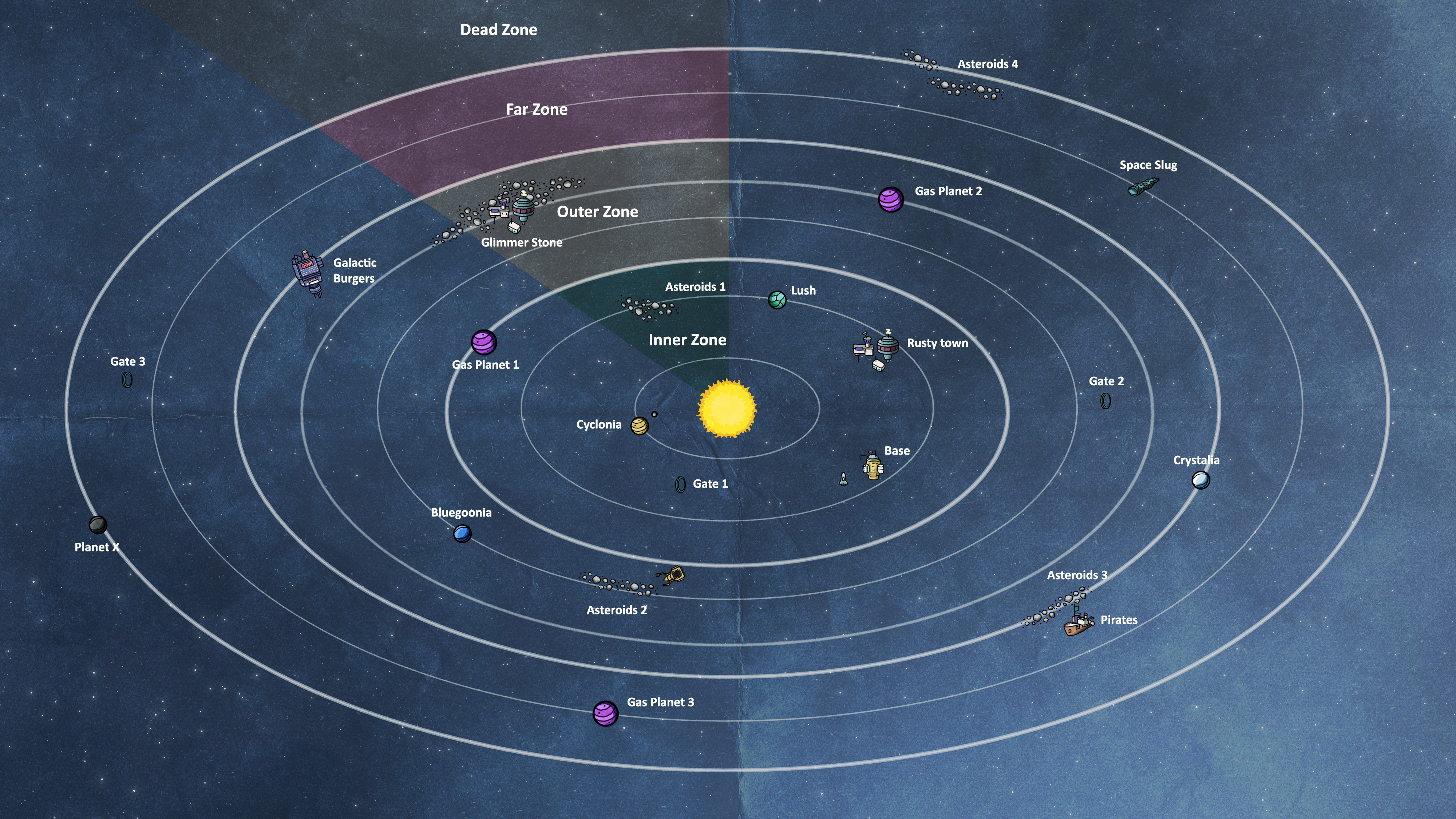 The star system in Space Chef will consist of four zones. Inner Zone, Outer Zone, Far Zone and the Dead Zone. You - the player will start the game in the Inner Zone. Here, you are close to the sun, you can buzz around in your scooter, visit Rusty Town, mine asteroids and collect scrap parts that are scattered just about everywhere. To be able to travel to the next zone, you need to find a way to upgrade your ship, because your scooter can’t take you too far out - yet. The next zone will offer you new challenges, new resources, new planets and so on - packed with delicious ingredients for those rare meals.