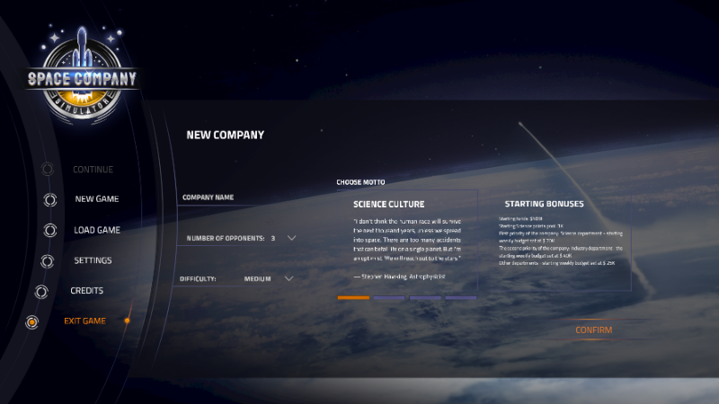 When you start a new game in Space Company Simulator, you are asked to pick a motto. Be sure to give this special consideration since it will define the early strategy of your company, as each motto comes with unique starting bonuses. Craft the strategy with first and second priority departments in mind and excel in the early stages of the space race.