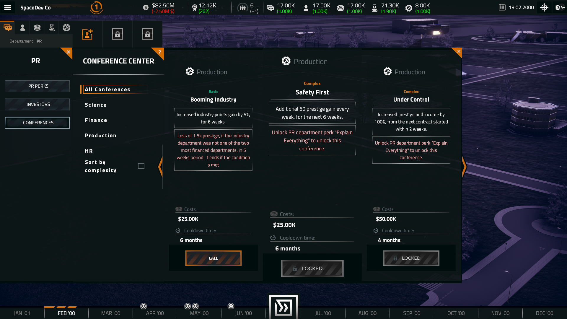 Each department has three conferences: one basic and two complex. Basic conferences are unlocked from the start, while complex ones require unlocking the corresponding PR perk.