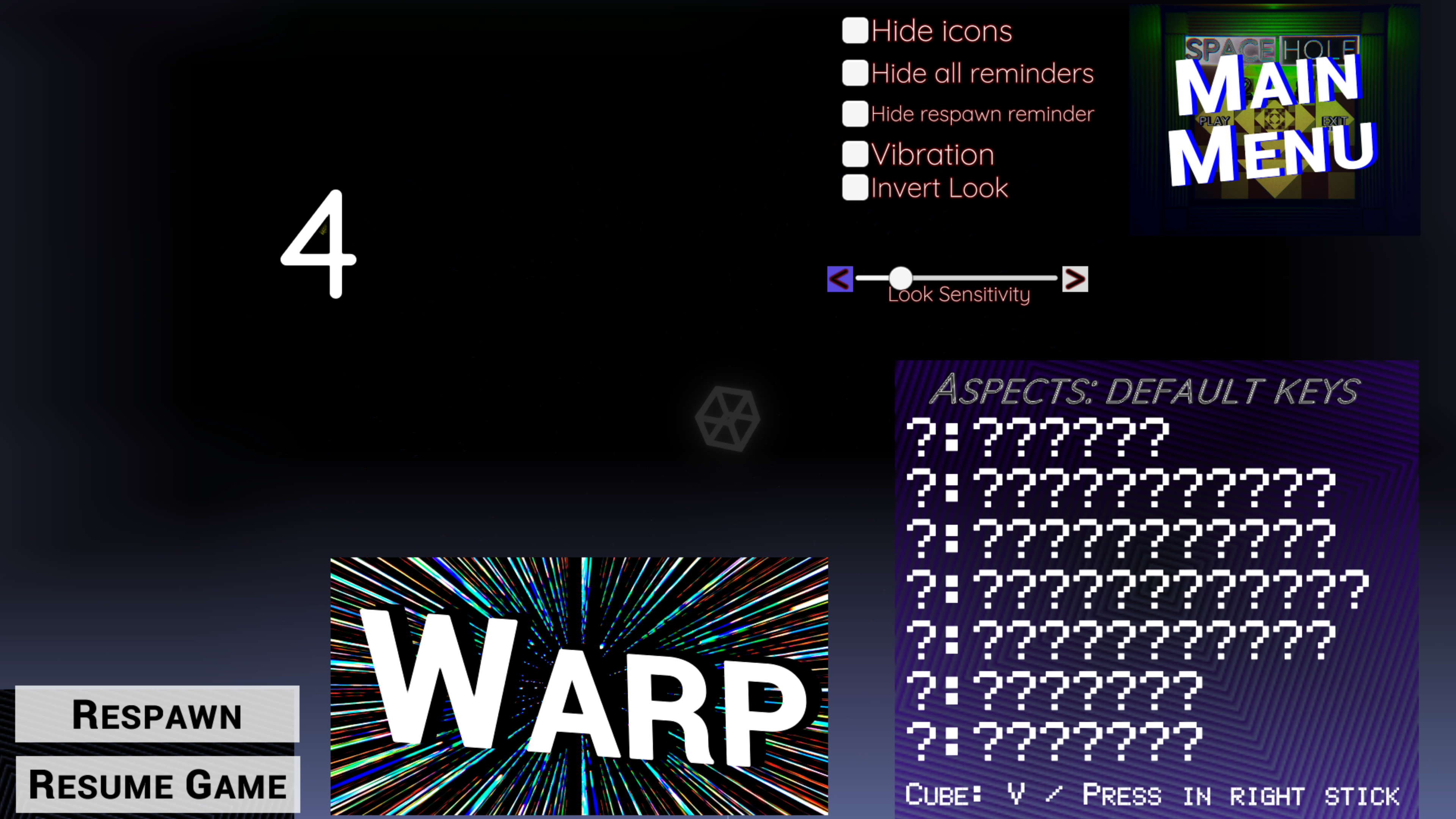 New pause menu (start on controller or Esc on keyboard), featuring a list of the aspects you've unlocked & their default key binding, the total number of space gems you've collected, and control/UI options. Control remapping & graphics settings remain in the pre-game launcher.