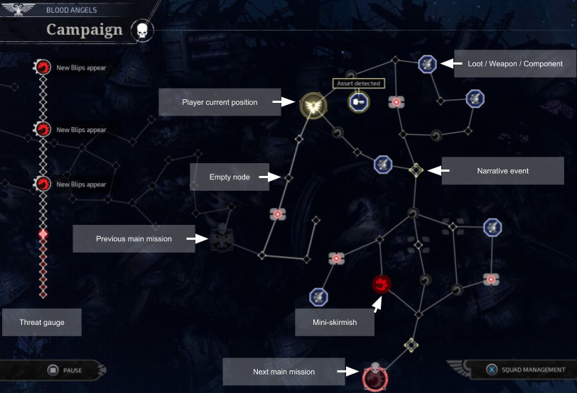 The big points in the maps are the main missions and the other nodes are smaller encounters that flesh out your progression through the campaign. Note that a node can also be empty. It’s up to you to either rush from one mission to another by taking the shorter path, or explore the macro map to collect optional bonuses and fight mini skirmishes.