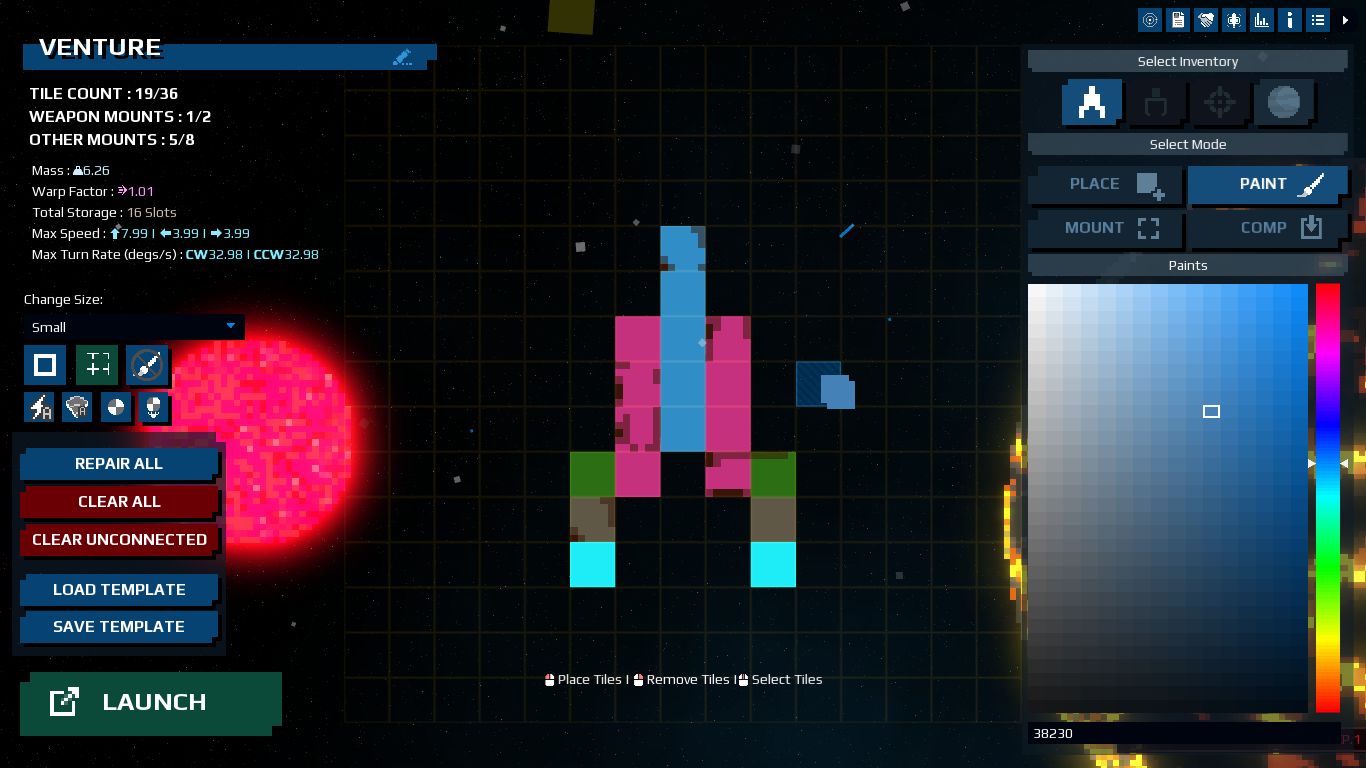 Additionally, we have overhauled tile colors. You can now pick from approximately 65,000 colors. Very dark, near black, colors are excluded because we think it's kind of lame to make an all black spaceship in a very black game. Blinking or light emitting choices still exist, and now can be placed with a specific tile.