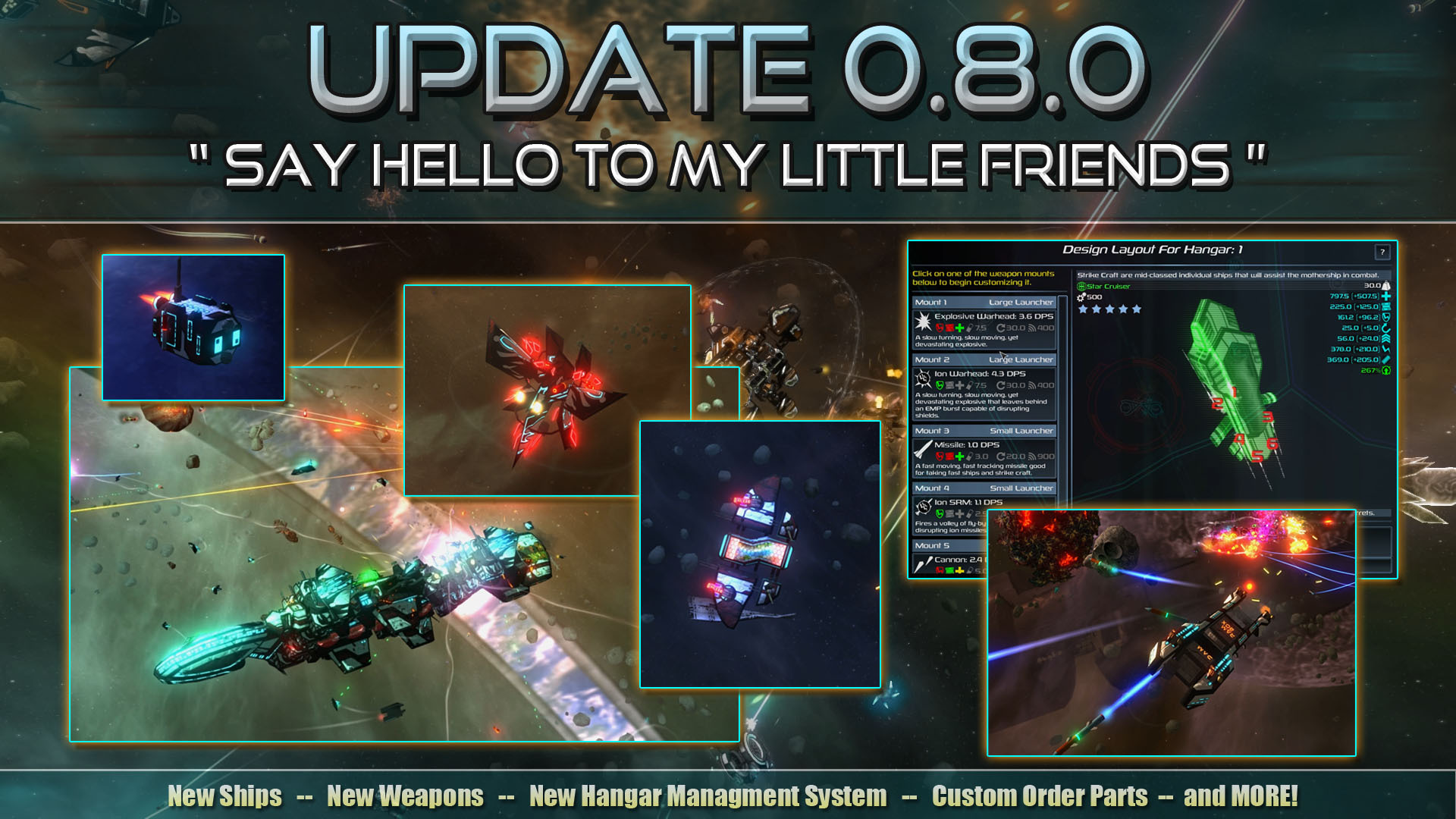 For our next update we will be conducting a major rework of the Strike Craft system. This will include implementing a blue print collection system similar to what we had in SPAZ 1. The mothership will now construct strike craft on its own using Scrap. We will also be adding an all new set of large strike craft as well as new unlockable configurations for the existing strike craft as their stars increase. This will be a pretty major change that will require rewriting some of the game flow and dialogue as well, so it will take some time, but we think the end result will be a really exciting addition to SPAZ 2.