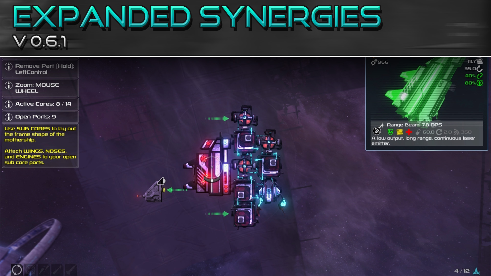 The biggest change is that synergies now spread to attached wings, noses and engines. The peripheral parts do not add to the synergy, but they do feed off the synergies of the cores that they are attached to.
