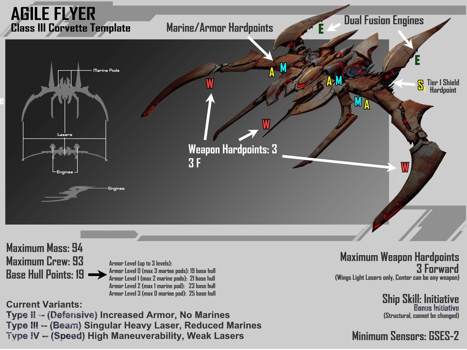 The Agile Flyer continues to be the choice corvette by most Genari Captains straight out of the academy. Considered extremely versatile with its combination of speed, maneuverability and firepower, all of its variants have been proven to be useful depending on the commander's combat style. Retired Force Commander Maghou Shiro, who currently is the head of the Genari command academy in Ghoda proposed a fifth variant: An Agile Flyer with a fission warhead amongst its laser array. He contemplated that the ship could become far more deadly with a properly trained tactical officer, and this would have the firepower to take out an enemy Sol corvette outright with one volley. The missile weapon system however, does drain a significant amount of power, thus making this ship slightly slower than its other variants.