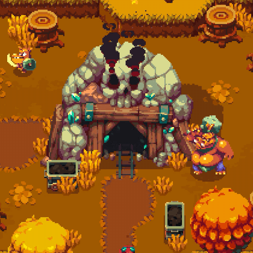 This cave is the exterior entryway to boss encounters, or Digsites, in Sparklite. We spent a lot of time iterating on it to get the look right, but we also found it wasn’t just about how it looked.
