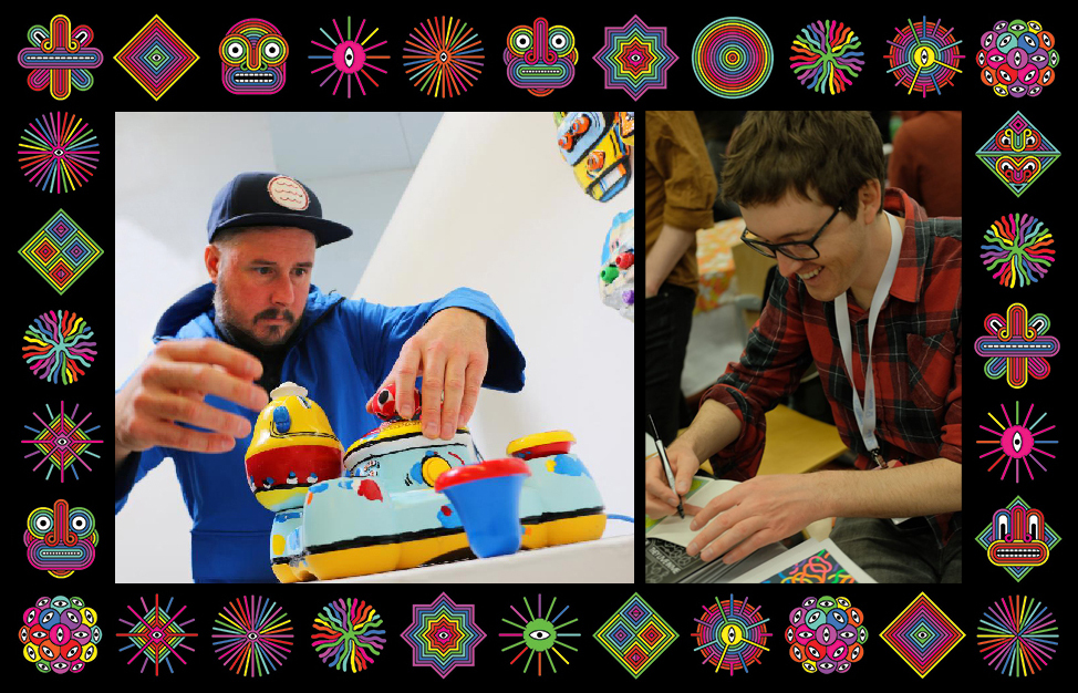 Watch Jesse Jacobs create one of his illustrations live, while Thesis Sahib plays beats on his Gameboy and other circuit-bent, modified toys. Stop by to ask questions, and even see their reactions to a collection of clips they find of people playing Spinch throughout the week!