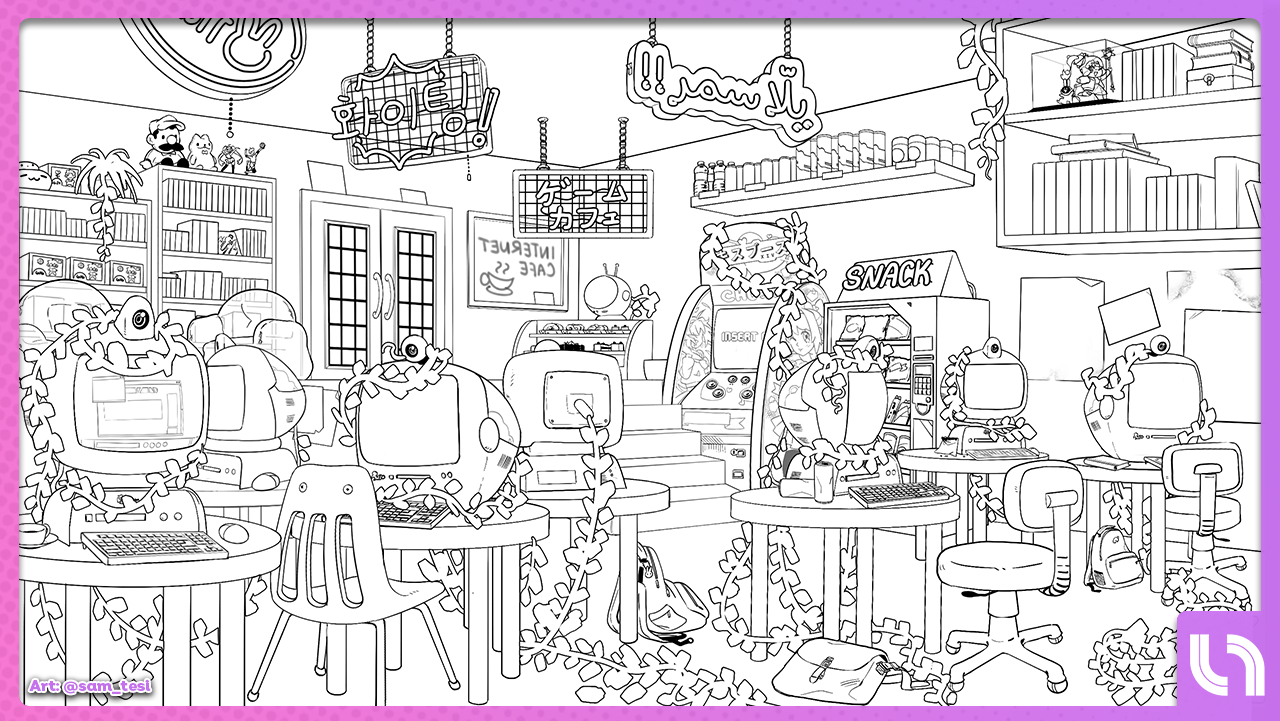 Here’s a peek at the line art (by the wonderful Sam) for Kedsi’s LAN Cafe (we’re saving the finals for the future!)