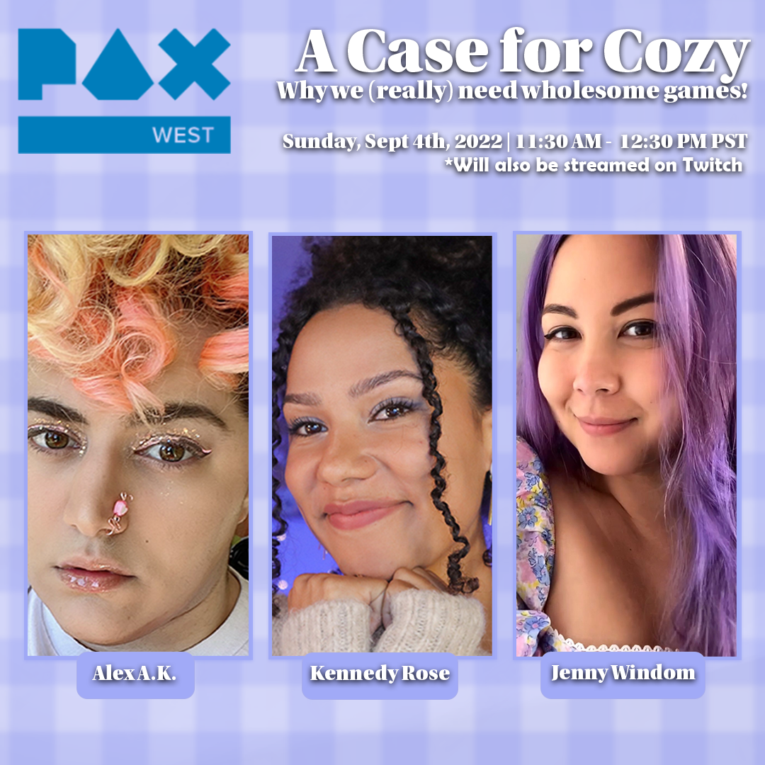 We’re participating in two events! The first is PAX West: Alex and Jenny are both taking part in the panel, “A Case for Cozy: Why we (really) need wholesome games!” This panel will be live-streamed on the Twitch channel for PAX, so be sure to tune in on Sunday if you’re interested in hearing more about why we should celebrate the gentler side of the game industry.