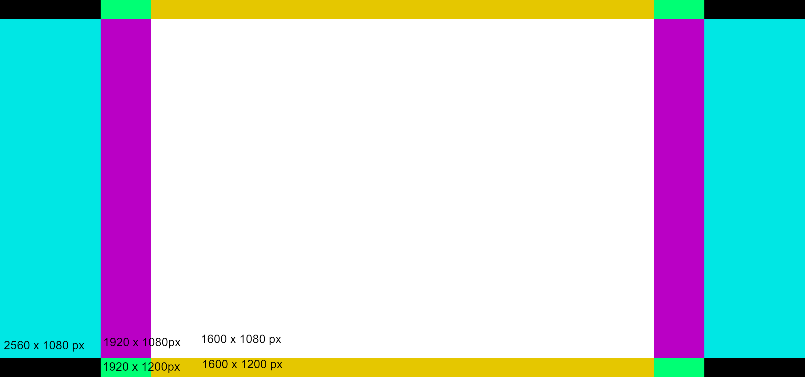This extremely colorful graphic defines the most popular screen resolutions. Turquoise until 21: 9, pink is 16: 9, green is 16:10 and yellow is 4: 3. On the other hand, white is the common part that will be visible regardless of what screen you have. This is especially important in terms of the arrangement of significant elements. We cannot put the face of the character speaking on the turquoise field because it will be invisible to some players playing at a different resolution.