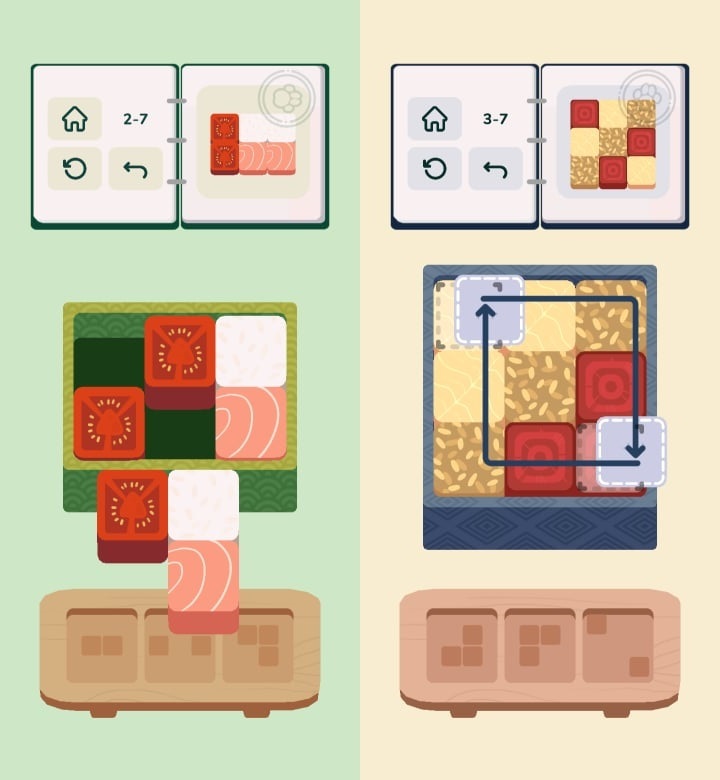 ➡️Many games are based on very specific mechanics, to which new mechanics are added. Once I had the pleasure of working on the game "inbento", the basic principle of which was to arrange the blocks of food in a specific pattern. The game starts with covering other pieces of food with food, and then evolves with new mechanics such as swapping food places.