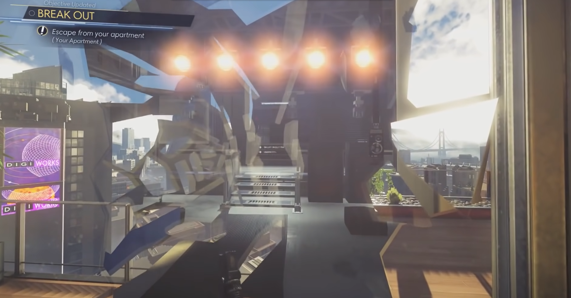 In the game Pray (spoiler), at some point, we get a key that can destroy glass surfaces. When we approach the glass in the starting location with a panorama of the city and break it, it turns out that what is behind it is not a city, but a laboratory. From the narrative side of the game, it turns out that we were locked in the test room all the time. On the other hand, from the mechanical side, the visible city is placed in a completely different place and is only displayed on the glass, and we were physically in the room that was inside the laboratory.