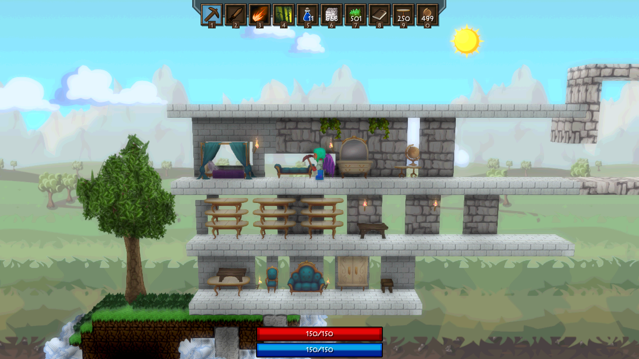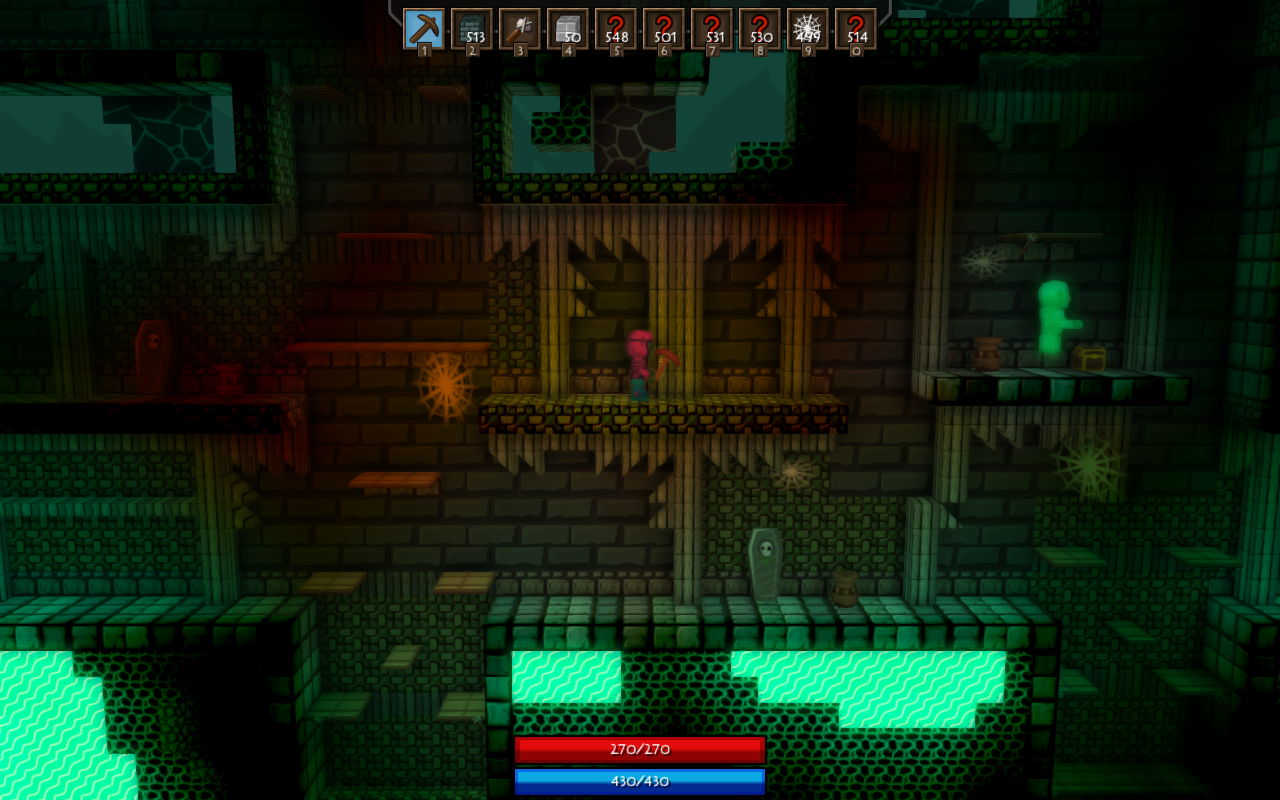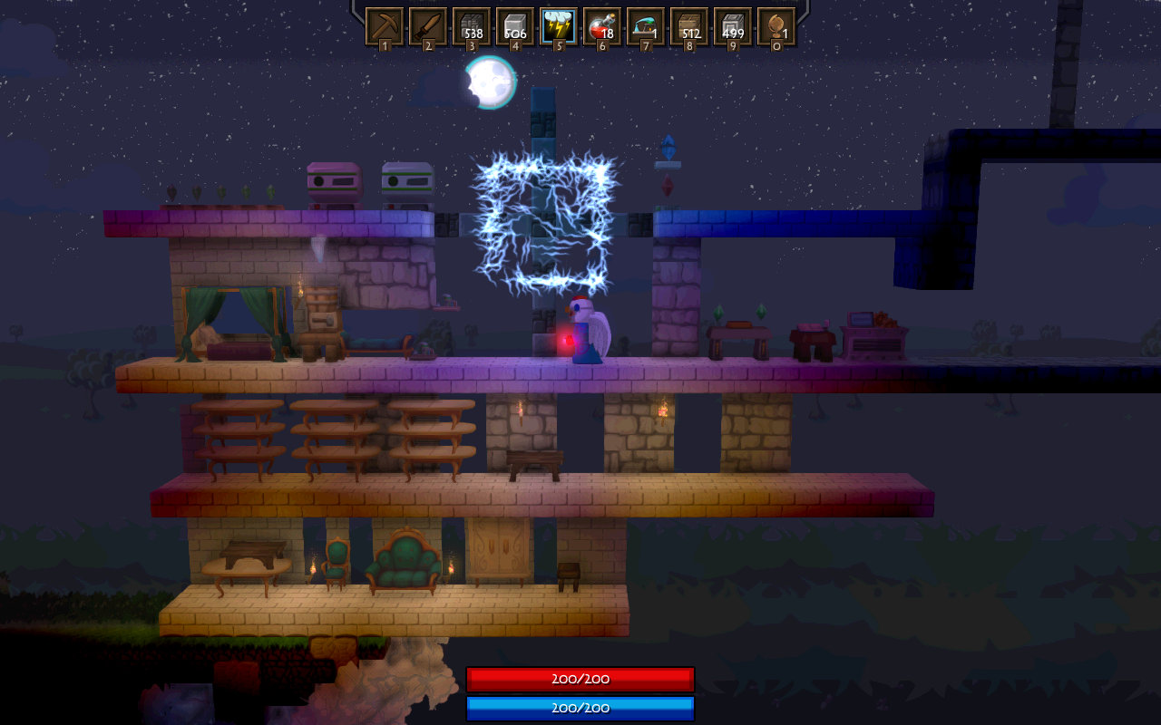 • Changed which glass block you get from smelting • Added trait "Runic Shield" • Added item "Runic Shield Rune"…. Which probably does what you'd expect ;) • Added a sort button for the main inventory • Added missing ammo type tooltip • Added team buttons within the character screen gui so you can switch "teams" • Added Chicken Cult armor • Added Refreshing Charge trait which gives a boost to mana regen at low levels • Added Charging Crystal item which can be used in armor crafting • Bug: Fixed an issue where the cursor wouldn't line up with when the screen is zoomed in or out • Added the mending stream trait which heals you whenever you cast a spell • The loop type now takes slightly more mana • The loop shape now checks and spends mana for it's children runes for every loop • The persistent aoe shape now checks / spends mana for it's children runes for every tick • The help ctrl now shows ingredient counts for crafted items • Bug: Fixed some issues with correct weapon size with advanced crafting • Added Revan's Mending Staff • Added a new model for potions so it can be used in advanced crafting • You can no longer have multiple damage types at the same spell level • Added error message for the spell system when you add mutators to a targeting rune that doesn't accept them • Added new background for the crystal expanse biome • Crystaline Grass can now be replaced by placing blocks • Added Crystaline Wood block • Added Crystaline Plank block • Fixed tooltip for Alchemy set • Added feather model • Fixed a symmetry bug in advanced crafting with opacity • Added new gem model for Crystal Shards • Added gem model for ice shards • Added a new chimney model and item. It is purchasable from Vanfyr • Added spell void ring which can convert some spell damage to mana • Added meteor ore • Meteors, surprisingly, now drop meteor ore • Reworked NPC dialog UI to look nicer • Added a medkit block which can be used to attract "Jane the Healer" to spawn • Added Vanfyr's Soulstone block which can be used to spawn vanfyr in your base • Reworked the game UI positions due to user complaints • Bug: Fixed some of the issues with icons flashing with the abilities on advanced crafted weapons • Added INVASIONS to the game • Added music for invasions • Certain mobs….. Can now open doors • Certain mobs can now mine through blocks • If no path is found to a player, mobs will attempt to find the closest point to them • Bug: Fixed an issue with magic color for the spell equip model • Added spell held effect for spells crafted with the earth type • Added spell held effect for spells crafted with the fire type • Added spell held effect for spells crafted with the arcane type • Added spell held effect for spells crafted with the air type • Rune targeting shape has been reworked to include different types and allow you to set the number of charges • Rune targeting shape can now be cast on interactable objects such as chests and doors and trigger when the object is used • Added option for rune targeting shape to block entities… What passes through can be used with the change target mutator • You can now charge placed runes by casting the same rune over the top of it • Added an option for rune targeting shape which will send you a message if someone activates it • Added an option for rune targeting shape which will prevent someone from mining a block until it's charges are complete • Bug: Fixed an issue with ai opening doors • NPC's can now be targeted and attacked by mobs • Invasions now have pre-reqs based on progress • Rewrote quest tracking code to Fix several quest related bugs • Added a missing tooltip for the advanced craft table quest • There is now money loss on death (25% - Easy, 50% - Medium, 100% - Hard) • Blinking will now allow you to escape pygmy spears • Added a velocity mutator to change projectiles speeds for an increased mana cost • Bug: Fixed some spacing issues in the spell creation gui. • Bug: Fixed a bug with colors not changing correctly • Added arrow of piercing • Added freezing arrow • Added damage arrow + 1 • Added a filter box in the spell create screen to help you search through your spells • Added a filter box to the spell design screen to help you search through spell parts • Added a watch model for use with the lucky pocket watch • Added stalagmites • Bug: Fixed an issue preventing chunks from loading correctly • Bug: Fixed an issue with the pyramid dungeon where incorrect blocks would spawn in background • Added code to double check and re-request missing chunks • Bug: Fixed an issue with NPC mouseover • Reduced the size of the rotation handlers in the advanced crafting window • Fixed the rotation handler to more accurately rotate in the expected direction • Fixed more map bugs • Reworked the animation handling to do client side calculations. This means animations are much more responsive for your character. Bug: Fixed an issue where attack animation's wouldn't play if you were gliding with wings.