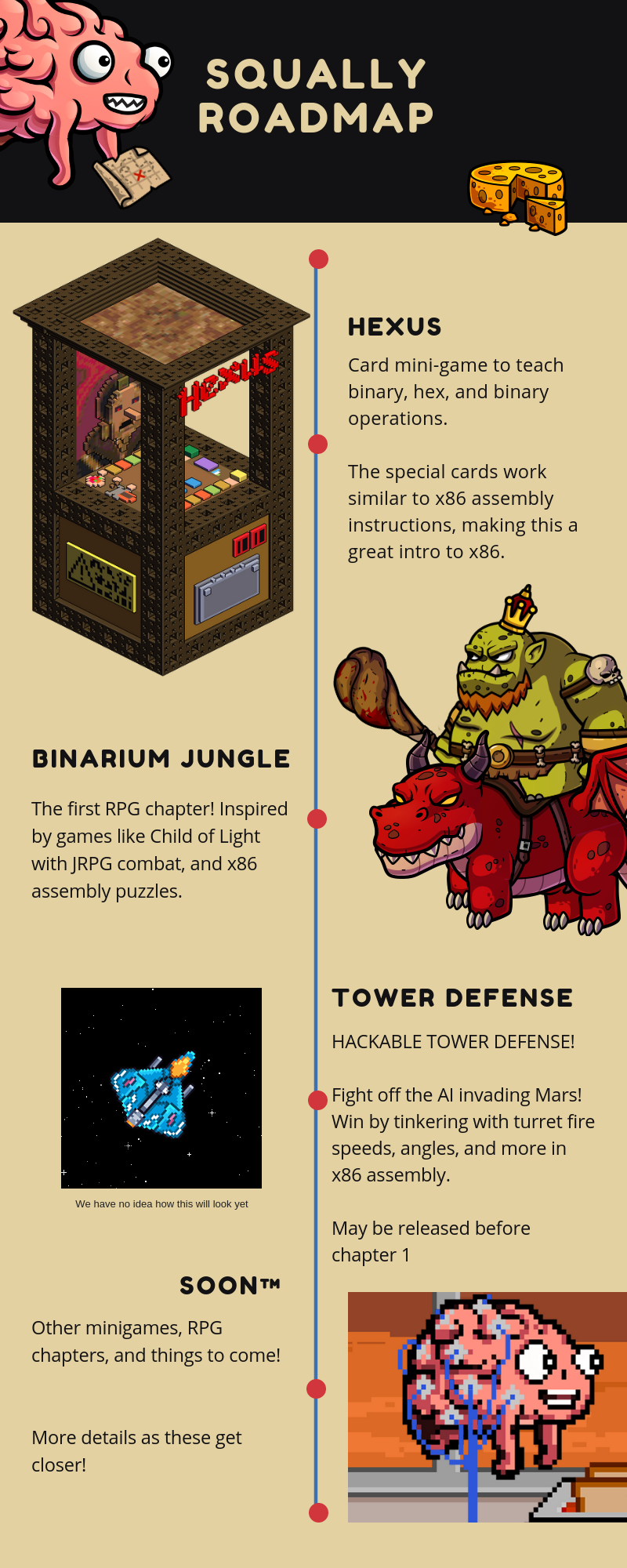 - Develop and release CH3 - Iterate on CH1/CH2 based on your feedback to improve the educational quality. - Release a better version of the deprecated mini-game Cipher. Cipher was a flop, so we'll be redesigning it to be more fun and educational. This will not be released until after CH3 probably, exact details TBD. - Address issues below.