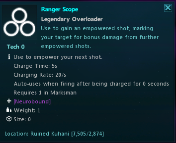 One of the key new mechanics is the Ranger Scope, which works similarly to the Sniper Analyzer but ramps up much faster, in 25 seconds rather than 2 minutes. Marking a target by landing an Empowered Shot, automatically available every 5 seconds, builds up stacks on the target. These marks echo every other preexisting marks damage each time they are applied, letting you amplify your damage against a target without forcing you to tunnel vision the target.