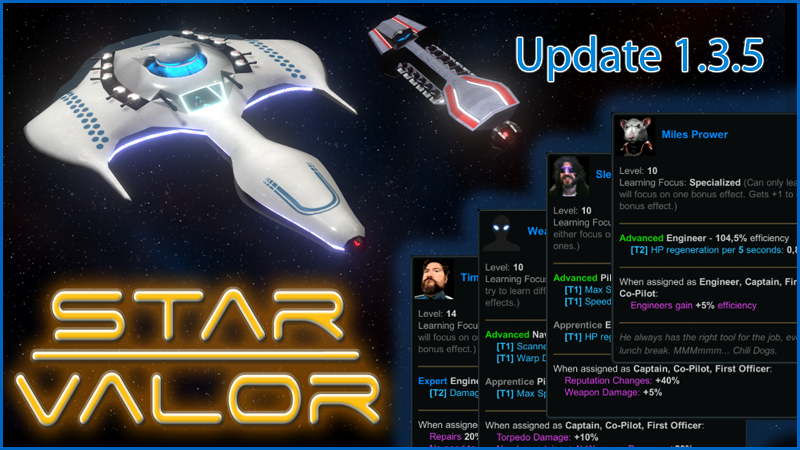 Added crew skill/profession: Tactician, which affects player fleet, with the following possible bonuses: Acceleration, Damage Resistance, Weapon Damage, Shield, Armor, Energy Generation, HP regeneration per 5 seconds, Bonus Fleet Commander.