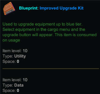 Added item: Upgrade Kit, which upgrades equipment up to green tier and an improved version, which goes up to blue tier.