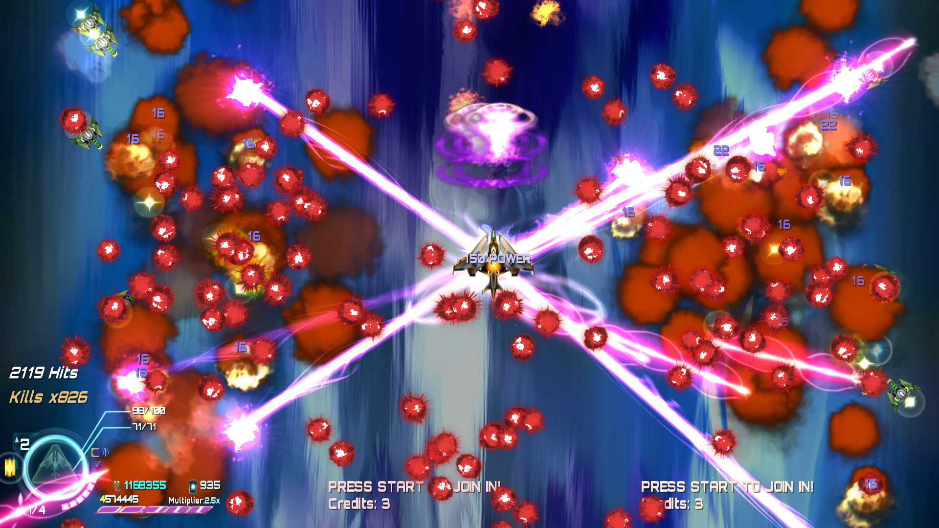 There're 4 different Survival stages, and you'll start with a certain amount of crystals and capsules at the weapon shop to spec your fighter. At the end of each survival stage, you'll be brought back to the weapon shop to utilize your earnings. There'll at most be sub-bosses in this mode. Any bosses that might appear will not stand as a defining objective to be destroyed in order to pass. We hope you'll have fun with this new game mode.