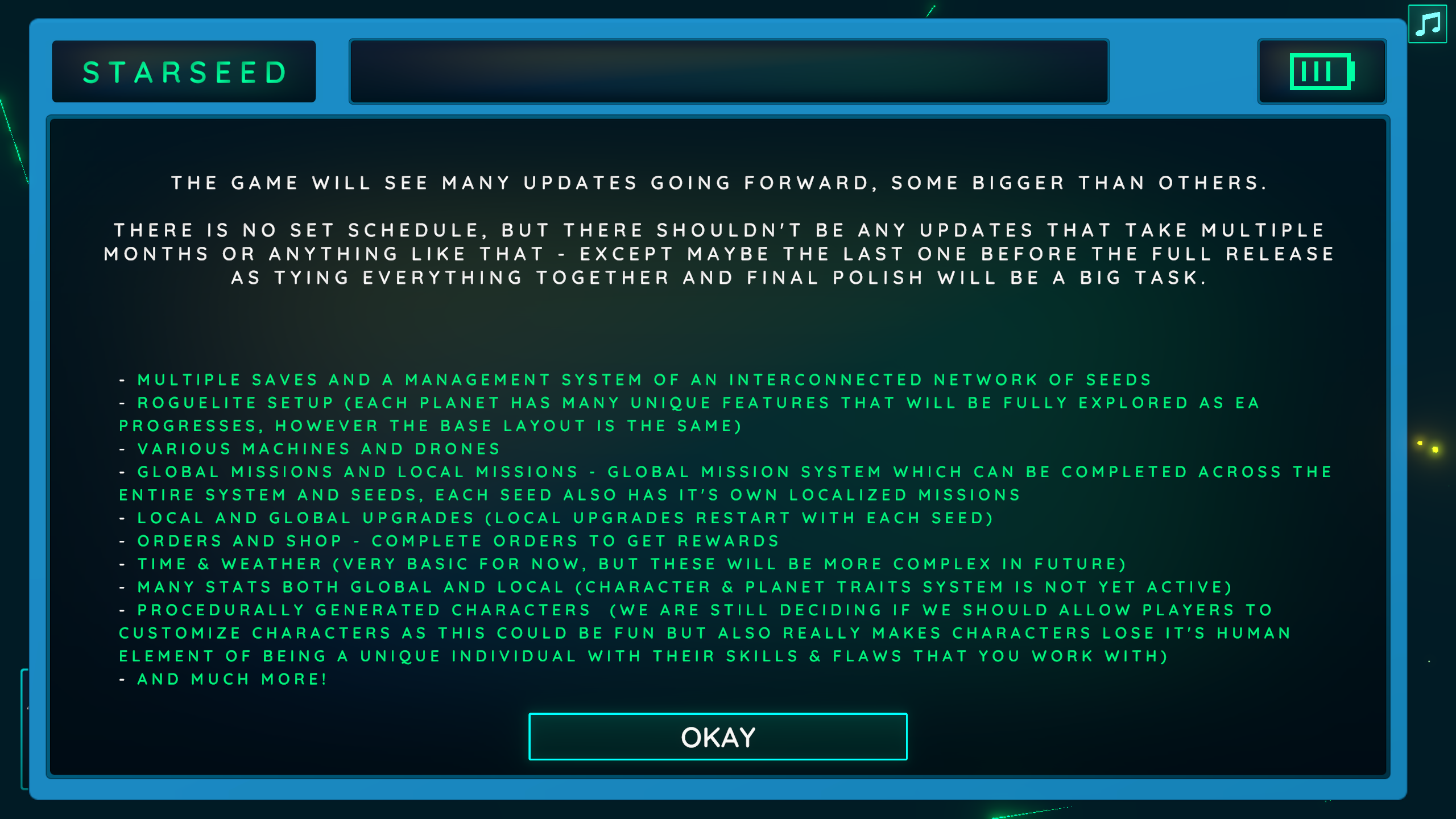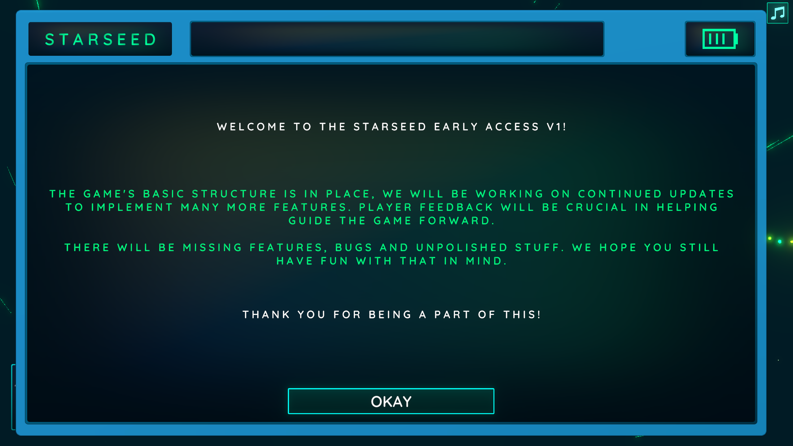 We are proud to be here and hope you will love and enjoy Starseed. There is still lots to do so we hope you will believe in us and give valuable feedback to help improve.