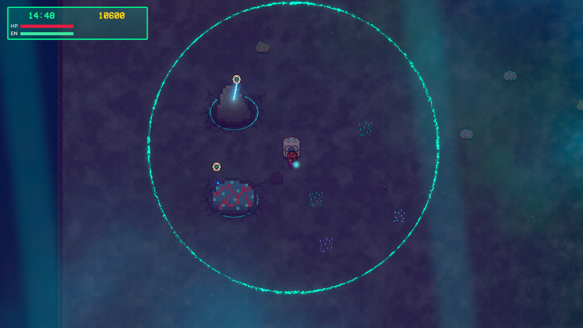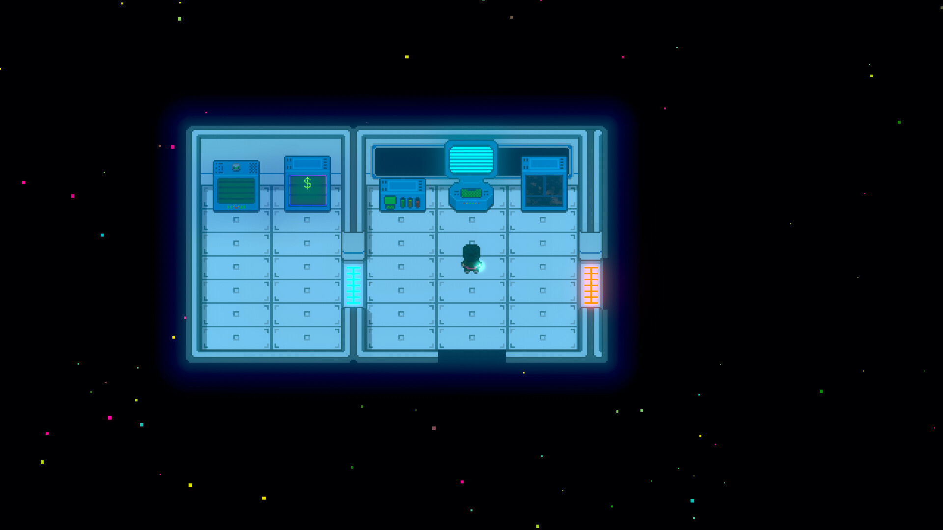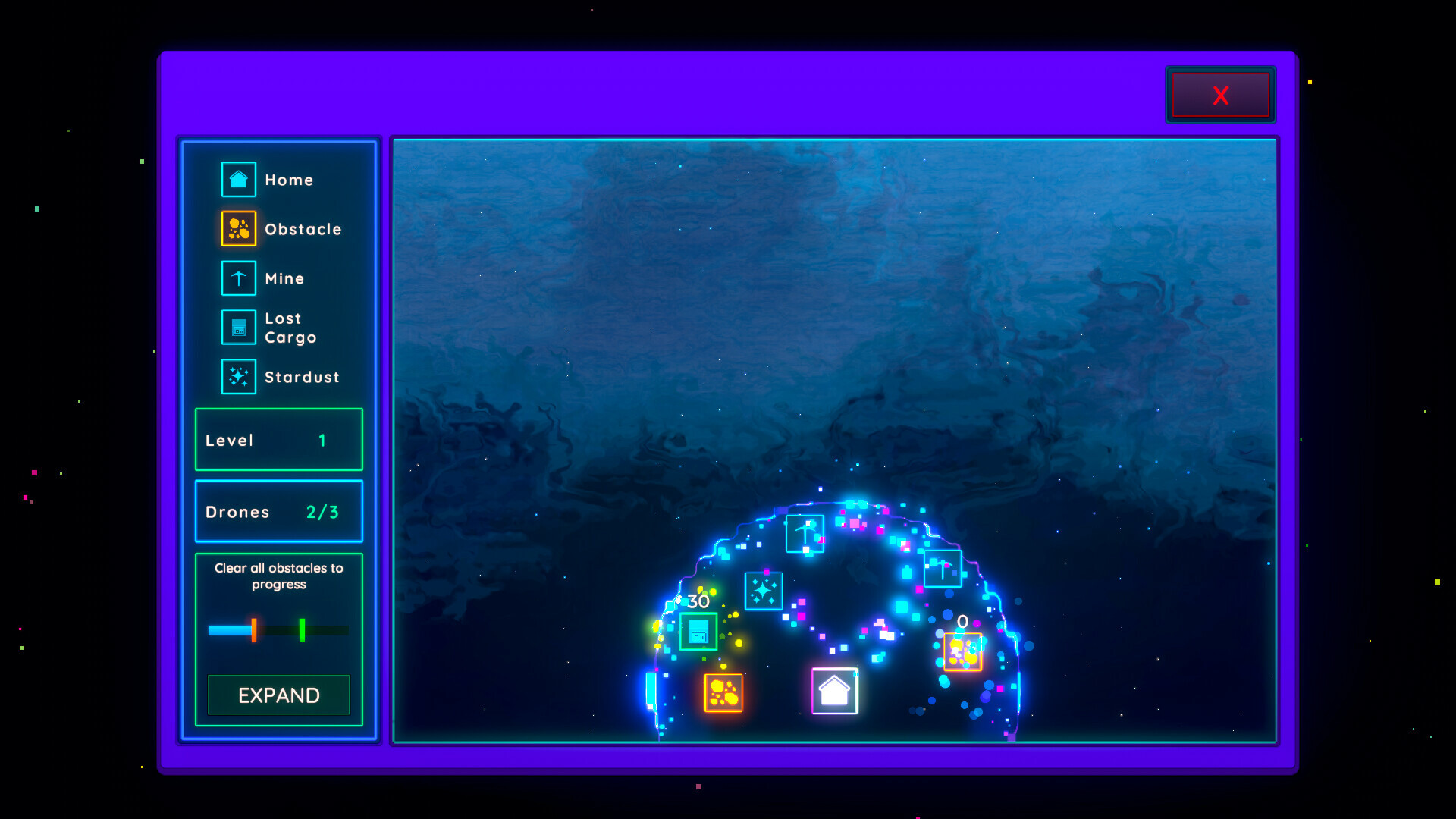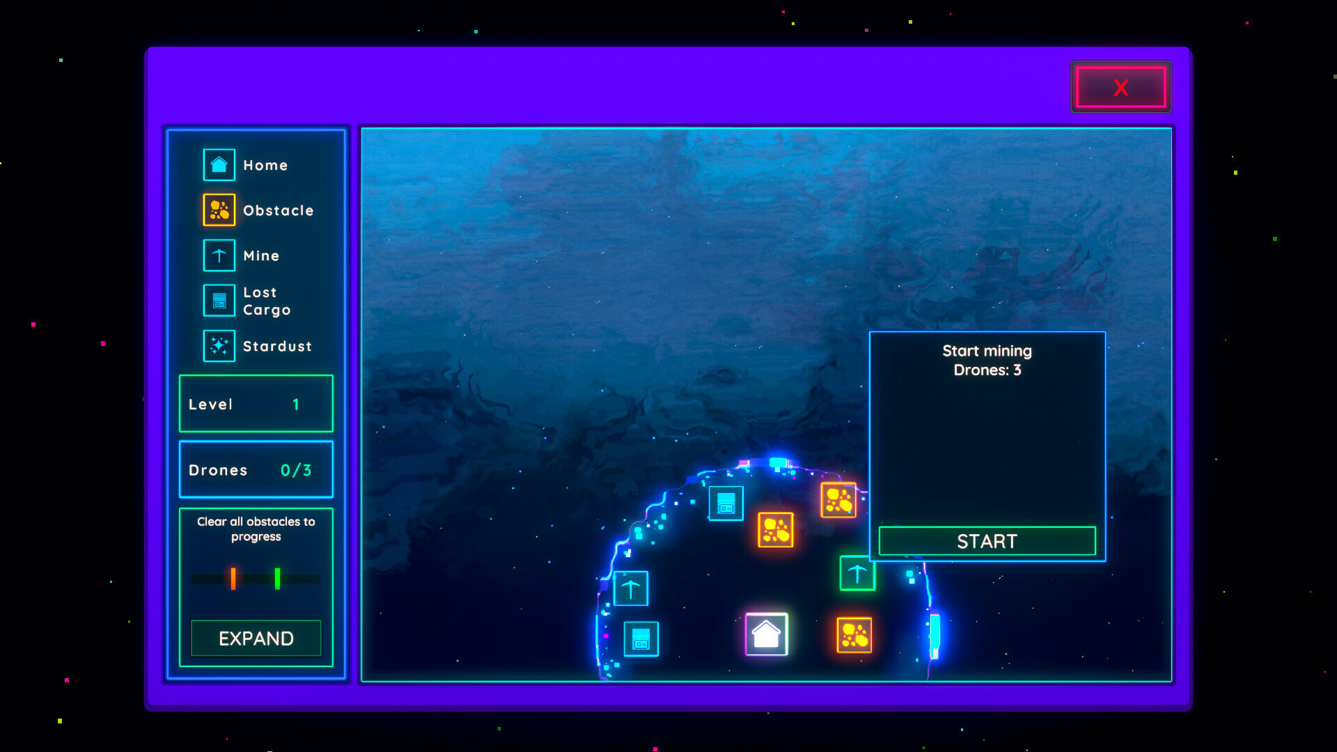 This shows your lab and galaxy scanner (names not final!). These are like idle missions of an expanding scanner system where you can use drones/bots to clear the way and discover more and also mine resources: