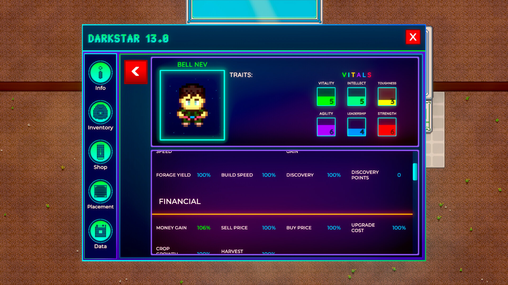 This will be the idle seeds: Seeds can be placed into an idle state. Then depending on the goals achieved and resources produced with them, they will then keep producing resources. Better, smarter and harder you work on them and cultivate them, the more resources they produce. Balancing this is going to be one of the hardest tasks! lol). You cannot access them again once put into this state. Only delete, replace or put on pause. There will be stats to upgrade affecting them, maybe even modifiers later on. (It's still work in progress so forgive the incomplete and filler info and ugliness):