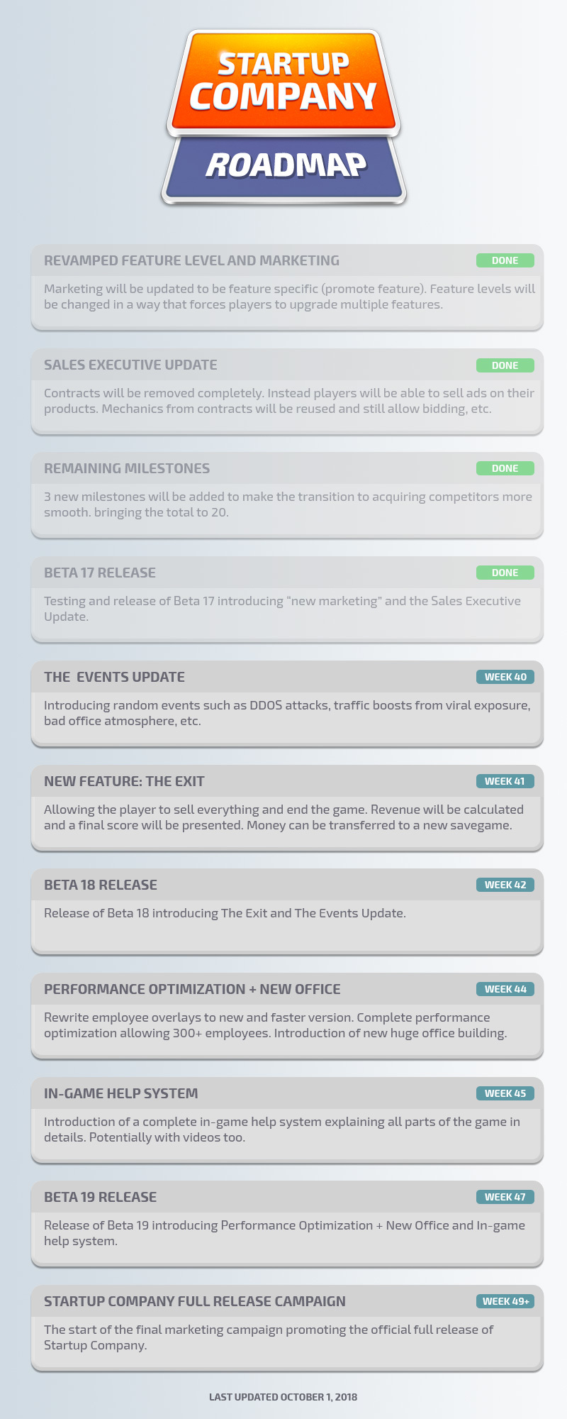 We can’t wait for 2019 to start. We’re going continue developing Startup Company according to our updated roadmap from December 7, 2018 but also include highly requested features/fixes from our players.