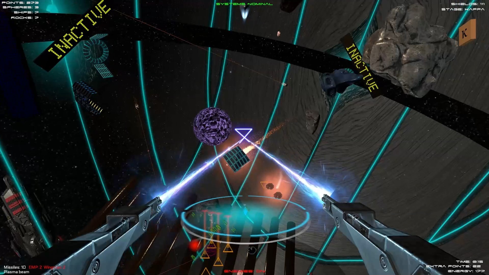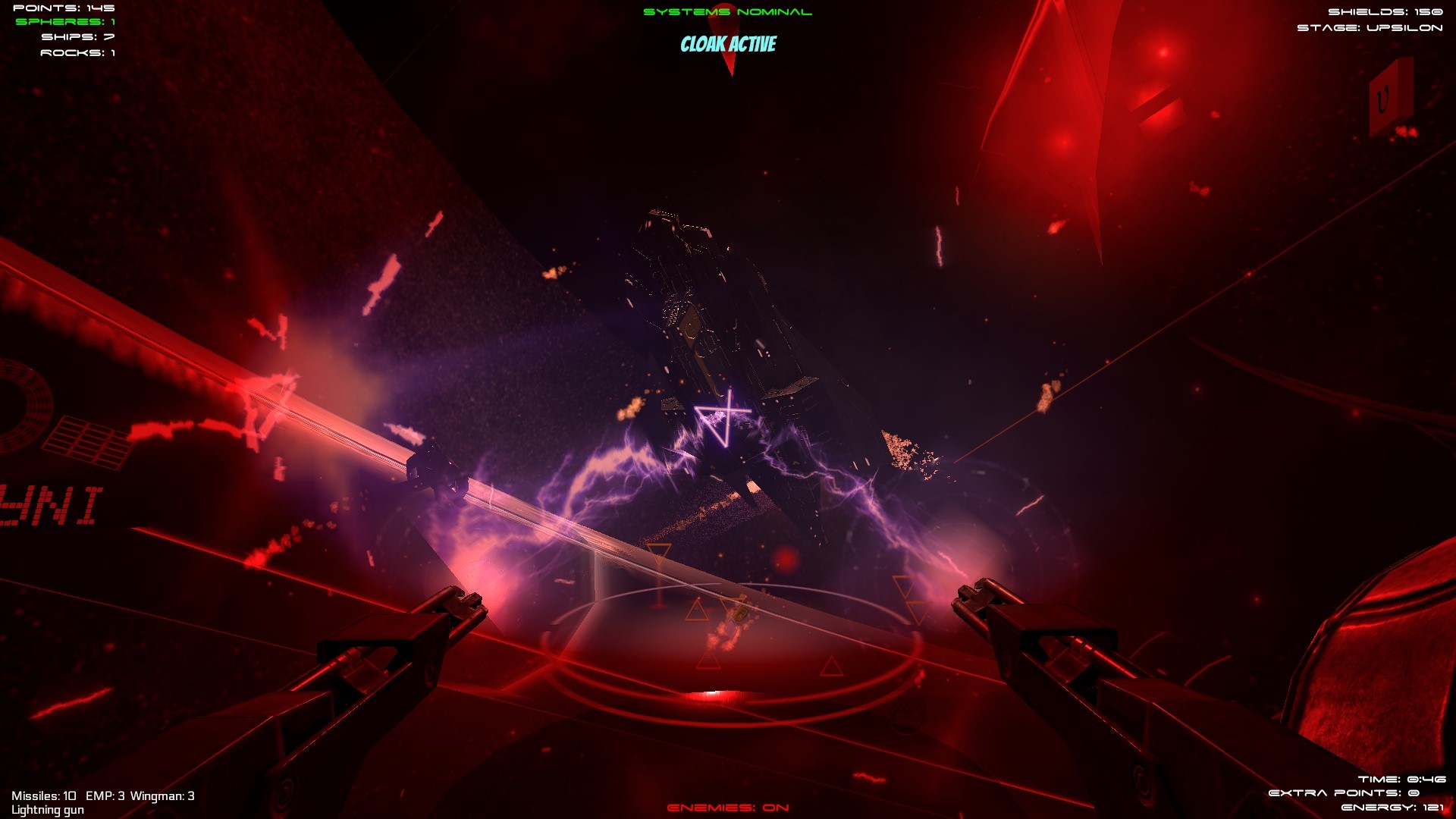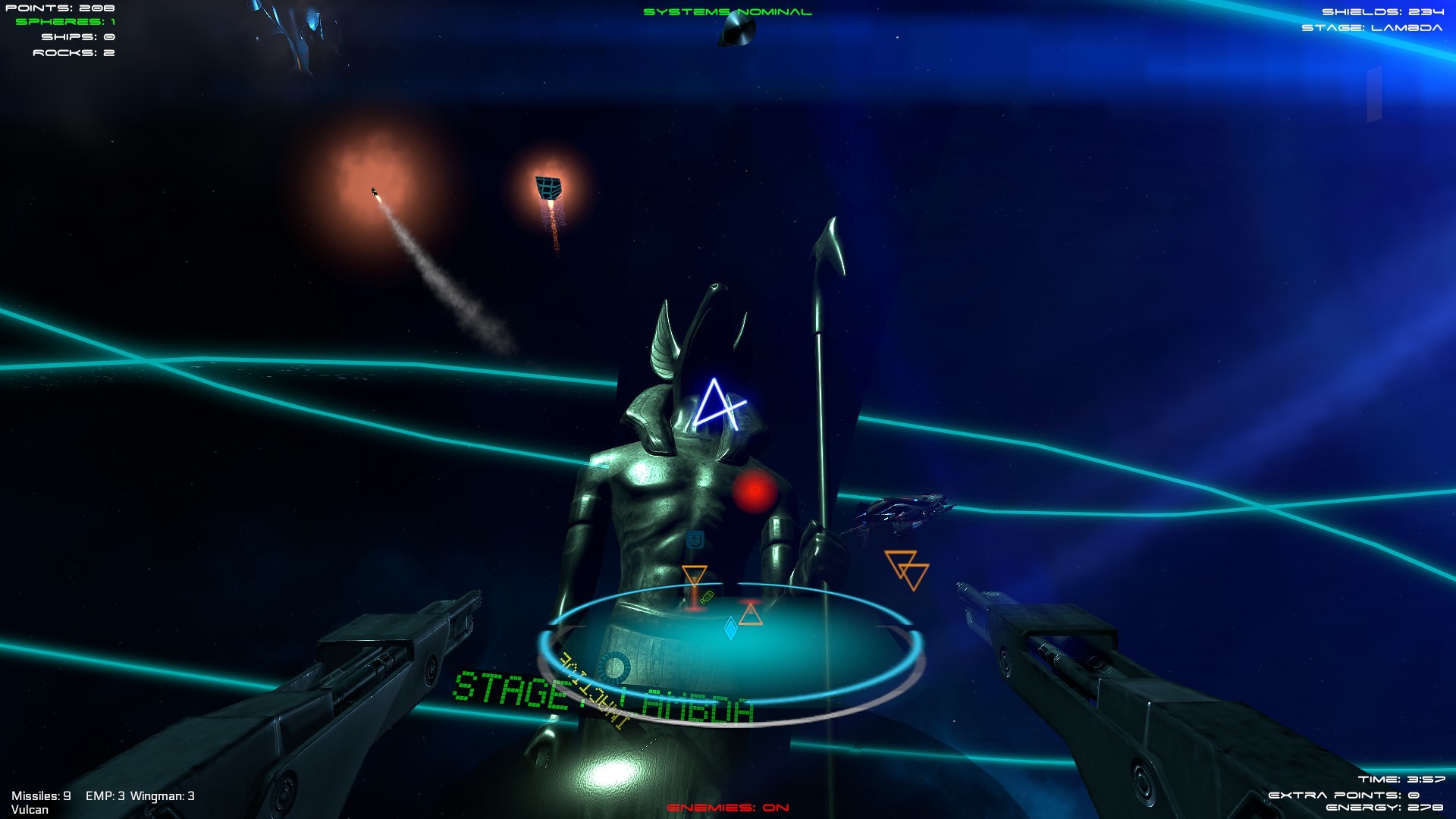 The vehicle is a space fighter, so we could also say that the game is also, in a way, a space simulator, since physics moves the ship at all times. A physics that can be increased or decreased at will, like so many other things. The sphere also moves under the laws of physics, but in addition, gravity, which is normally zero, can be altered.