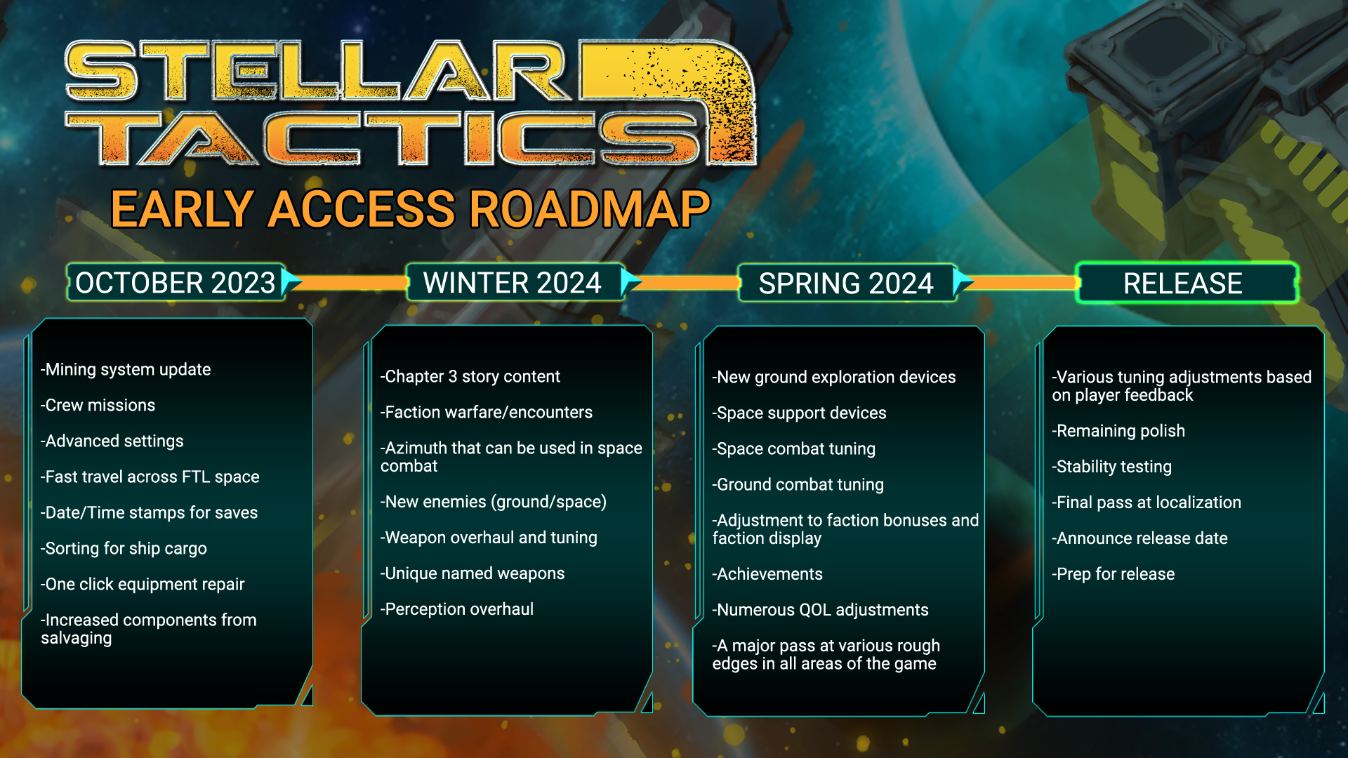 Stellar Tactics has been in EA for a long time. I realize for some, this has been annoying. People want to play a final game - right? Others don't mind contributing to the game with ideas, feedback and bug reports. I have a lot to be thankful for in that the community has been incredibly helpful in so many ways.