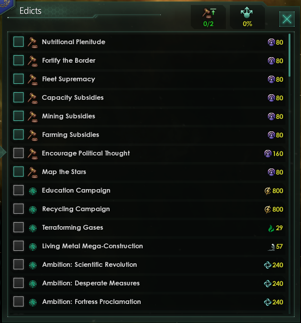 No longer a food policy (they don’t exist anymore). There are different versions for Hive Minds and Rogue Servitors. Resource Edicts, Campaigns and Unity Ambitions The model for the new Edict Capacity doesn’t fit very well for all types of Edicts, which is why the rare resource Edicts, Campaigns and Unity Ambitions remain unchanged and keep working like you are used to. This is also better for modding purposes, so that modders have the opportunity to use Edicts however they see best.