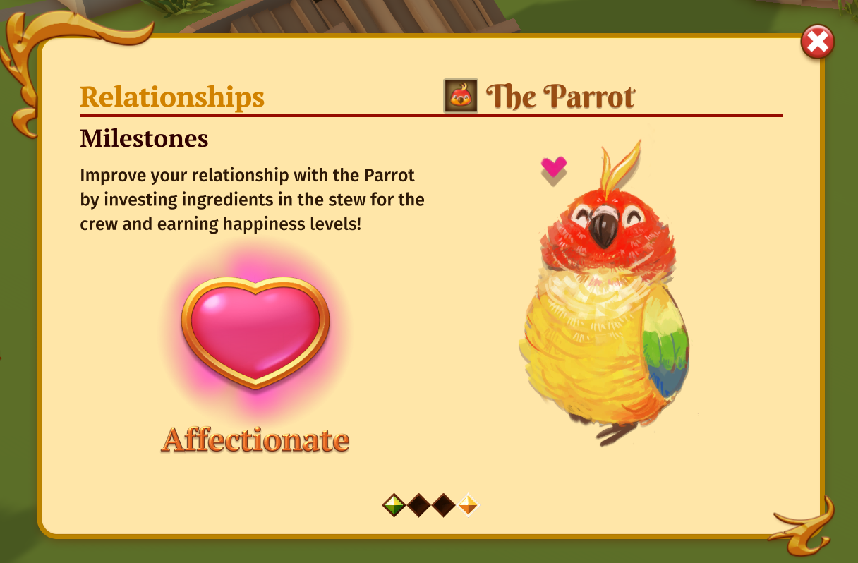 You can now build your relationship to the Parrot and the Ancestor! Improve your relationship with the Parrot by investing ingredients into the stew for the crew and raising your crew's happiness level!